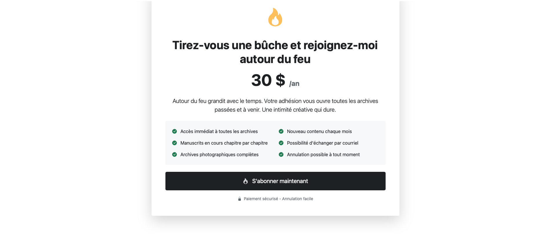 Deuxième étape : S'abonner comme membre. Une fois votre compte créé et après vous être connecté, le même bouton «Autour du feu» vous mènera à la même page d'information avec un encadré d'abonnement au bas de la page (voir ci-dessous), où vous pourrez devenir membre pour 30 $/an et accéder à l'ensemble du contenu exclusif.