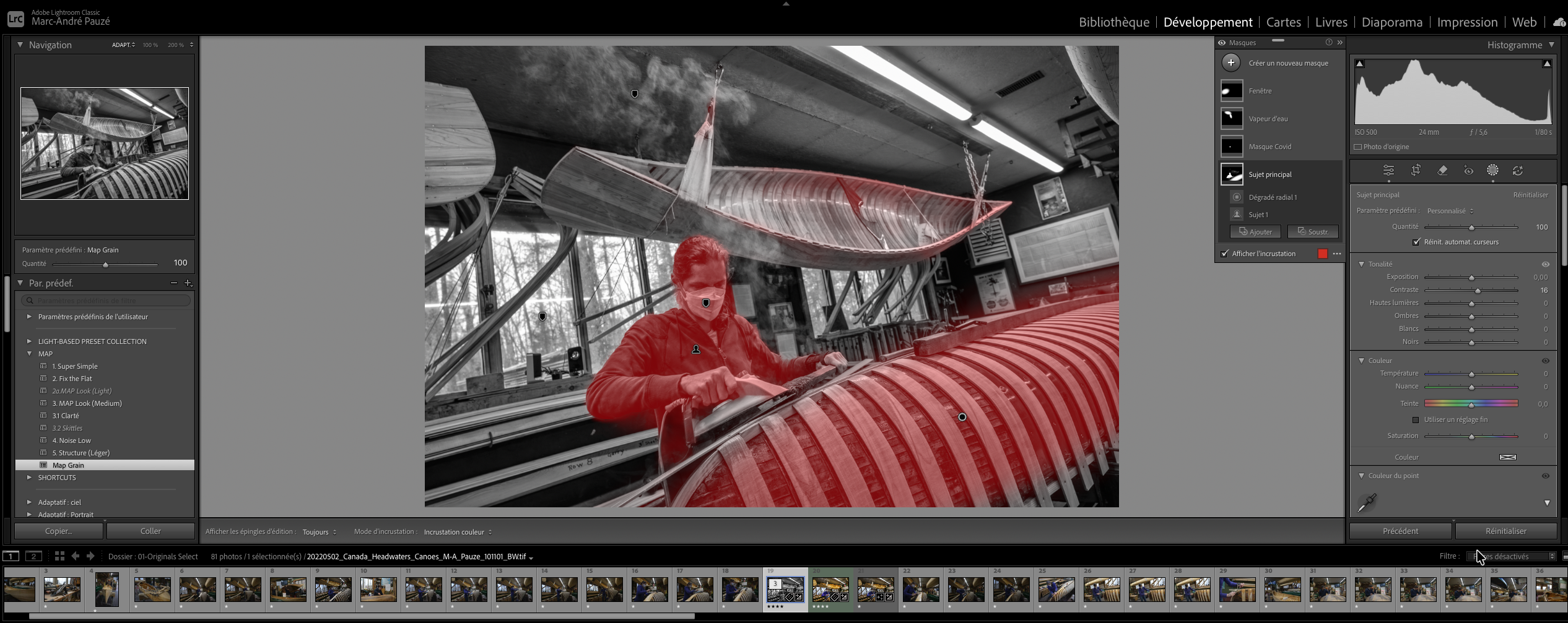 Voici concrètement à quoi ressemble ce travail artisanal dans Lightroom. Les marqueurs sur l'image déterminent les zones (ici une zone en rouge) - les masques que j'ai créés pour travailler cette image zone par zone: éclaircir le visage de l'artisane, donner du relief au canot suspendu, assombrir l'arrière-plan, révéler les textures des membrures. Chaque masque (listés à droite) représente une décision consciente. C'est du travail manuel, zone par zone, exactement comme le dodging et burning en chambre noire.