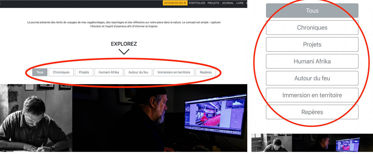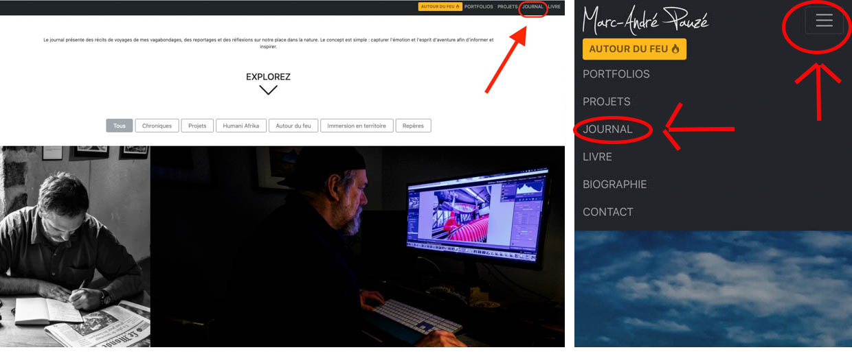 Cliquez sur Journal dans le menu principal du site web marcpauze.net. Sur mobile, les trois barres horizontales ouvrent le menu complet.