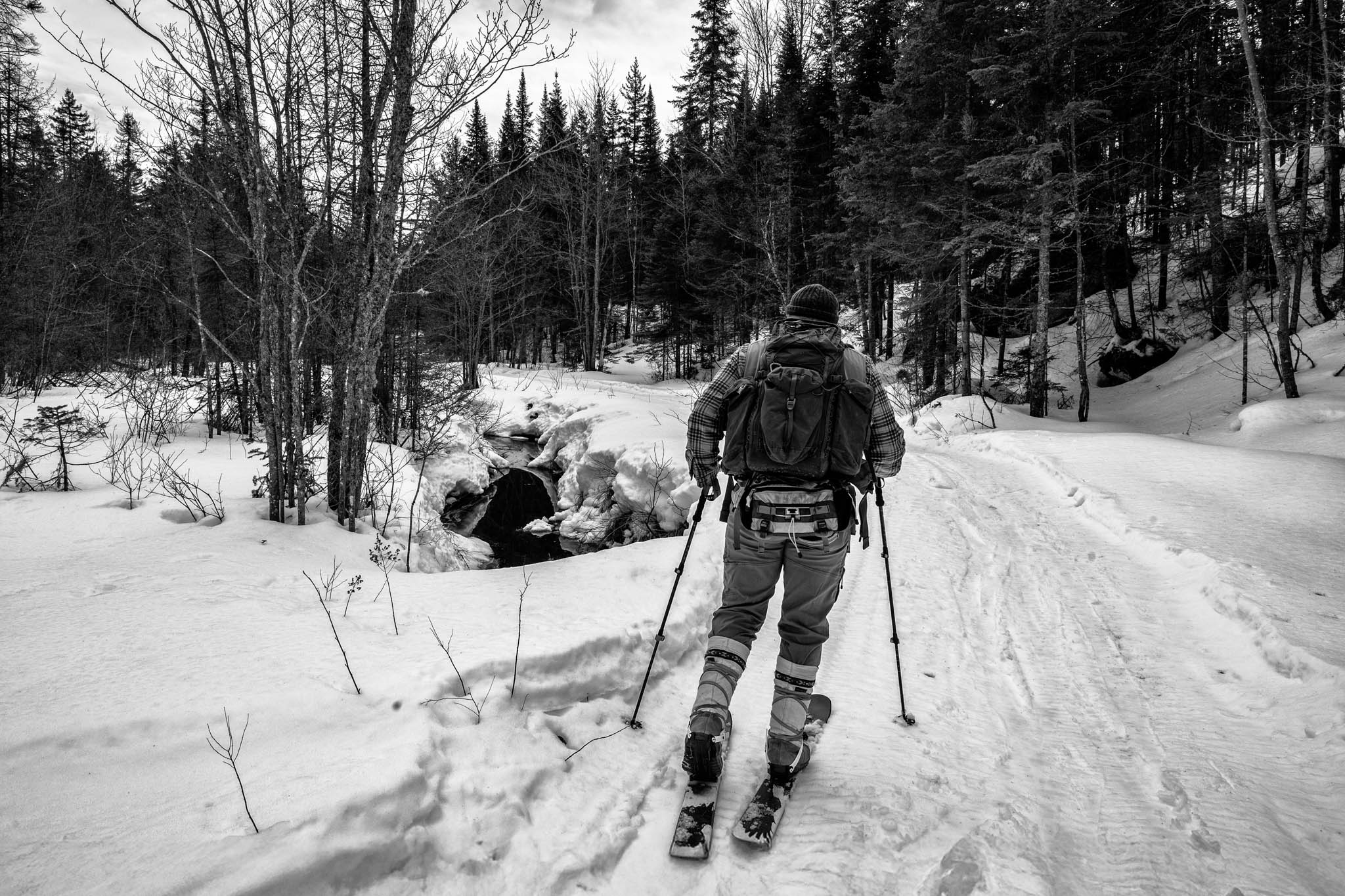 Les marécages se traversent facilement. Les anciens chemins forestiers, ces corridors creusés autrefois par les chevaux de bûcherons, offrent exactement le terrain pour lequel cet outil a été conçu : plat, semi-ouvert, avec une neige qui varie d'un appui à l'autre. Je passe sur des pistes de lièvres, une longue trace de loutre entre deux ruisseaux, les empreintes profondes d'un orignal qui a traversé la nuit dernière. Je les vois. La tête est disponible pour les voir.