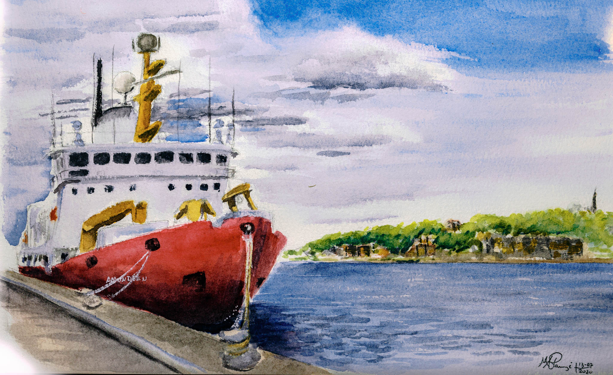 En fin d'après-midi, je redescends sur le quai avec mon carnet d'aquarelle et peins l'Amundsen amarré, sa coque rouge reflétée dans le fleuve. Il fait chaud. Des voiliers glissent d'une rive à l'autre. L'île d'Orléans barre l'horizon vers l'aval — c'est au détour de cette île que les moteurs avaient cafouillé lors du tout premier départ de l'Amundsen vers l'Arctique, dix-sept ans plus tôt. Une histoire que le commandant Lafrance m'avait racontée, livre de bord à l'appui, les notes manuscrites de l'époque encore lisibles entre ses mains.