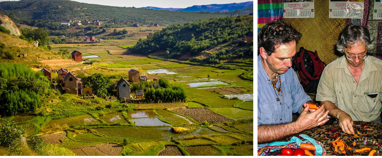 À droite: La vallée où nous sommes descendus en sortant de la forêt. À droite: Préparation de notre repas de riz et légumes chez Roland.