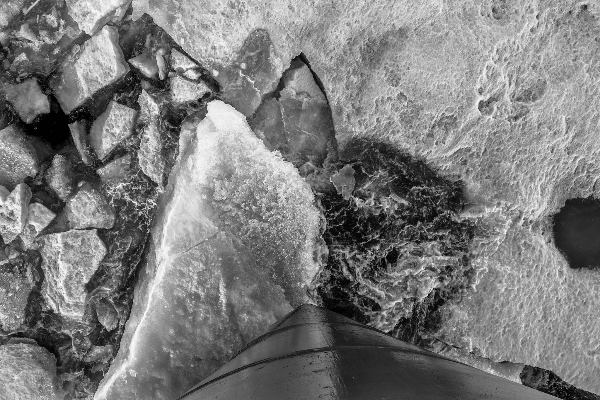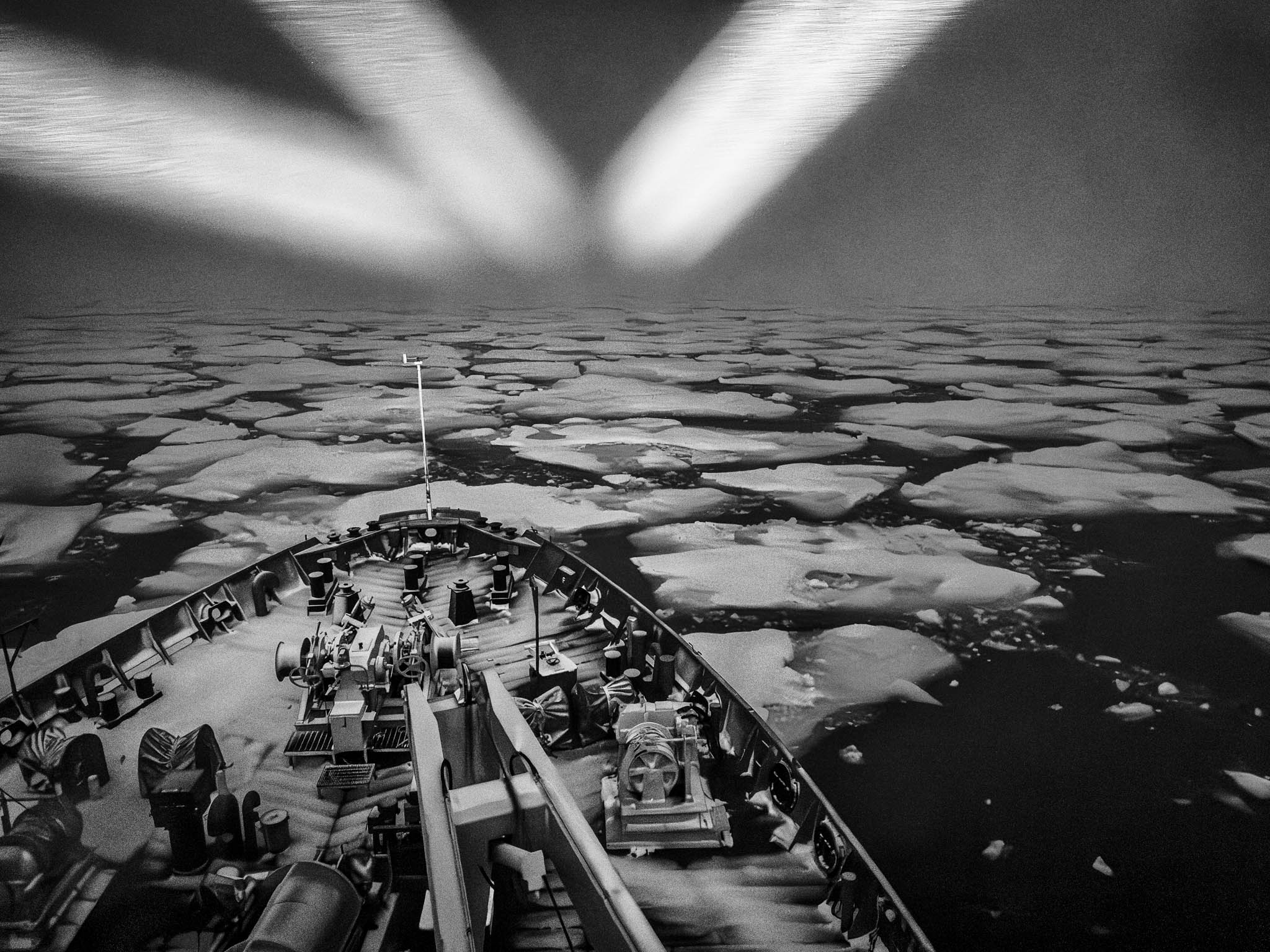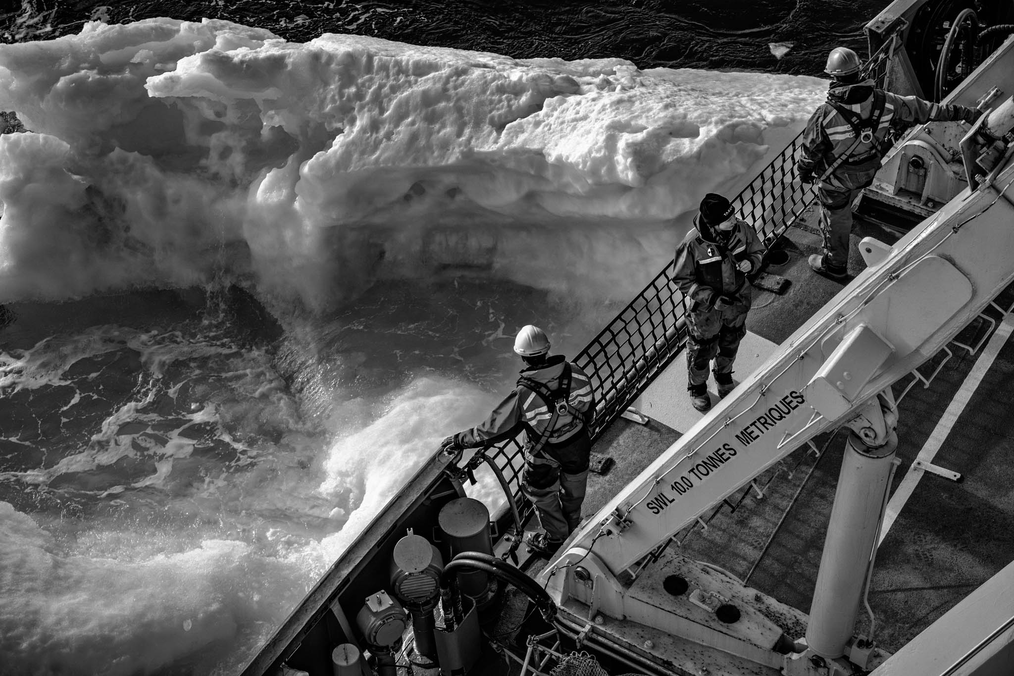 11 août 2019 — Mer de Baffin. Le commandant Gariepy se protège du vent derrière un iceberg pour récupérer une rosette de réserve après que la rosette principale de l’Amundsen se soit détachée et tombée à 225 mètres de fond. Pour remplacer les instruments manquants, il a fait appel au NGCC Louis St-Laurent, stationné à quelques centaines de kilomètres. Une fois la rosette réparée, il a fallu la transférer sur la barge, la transporter de l’autre côté du navire et la remettre en place dans son garage.