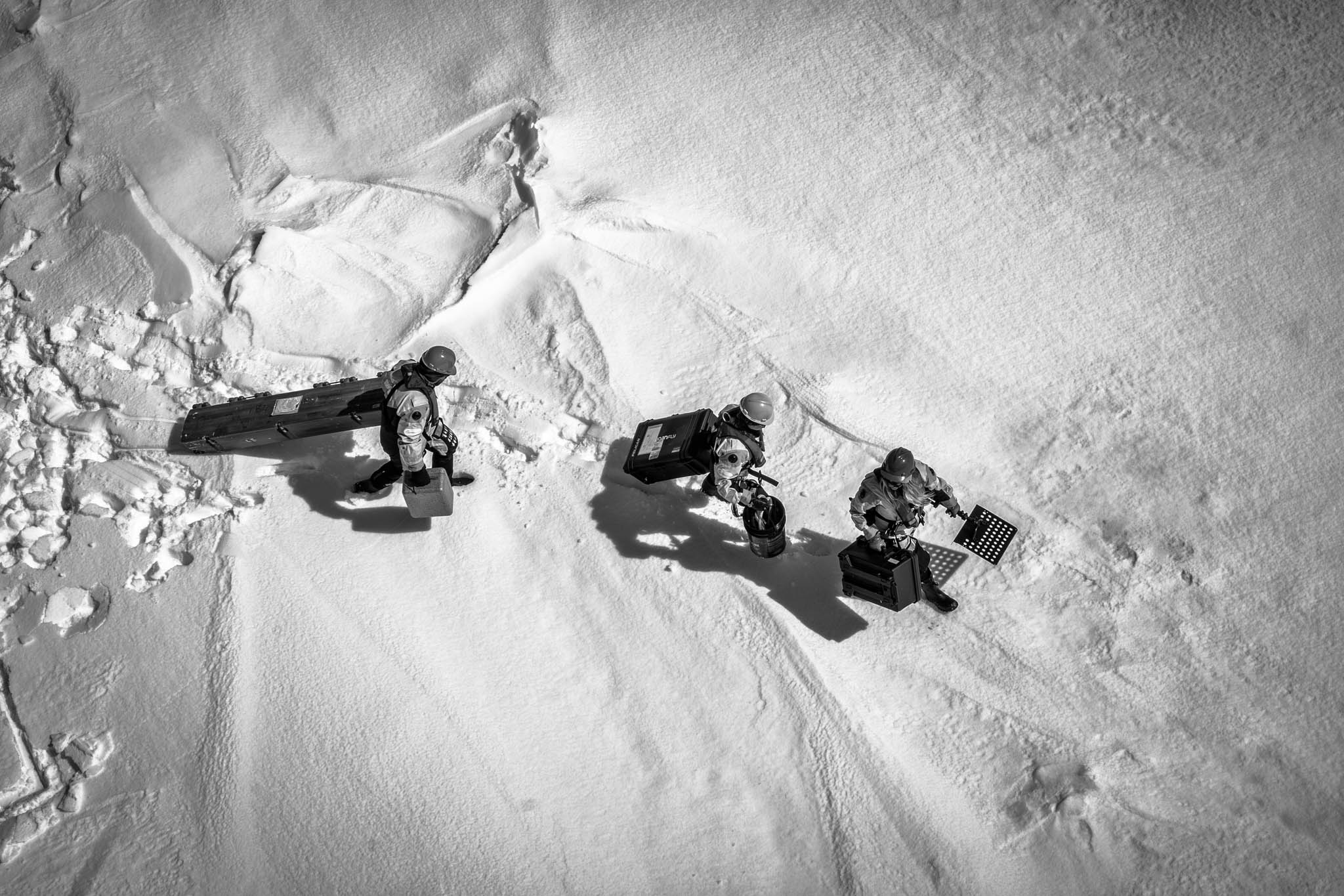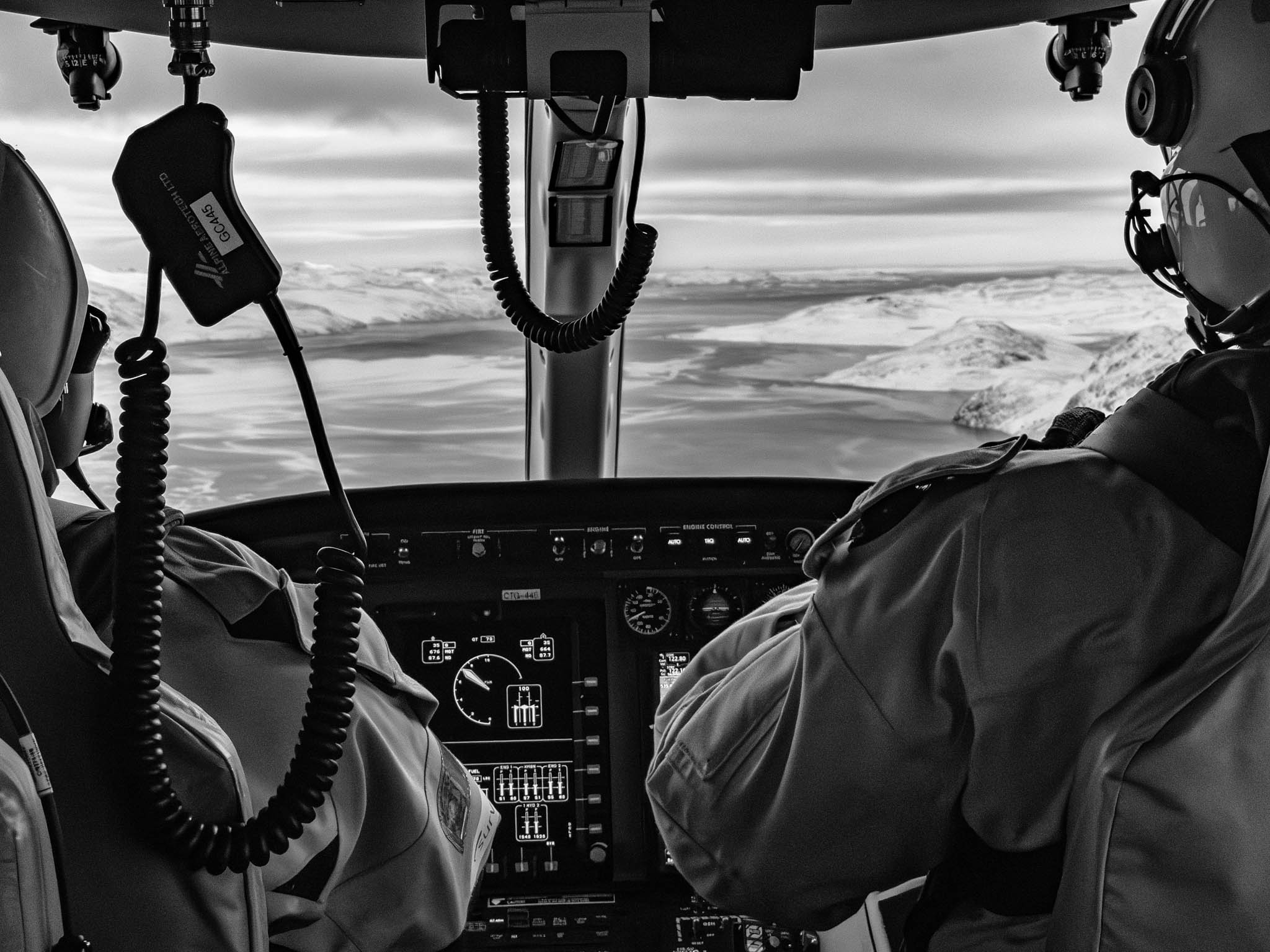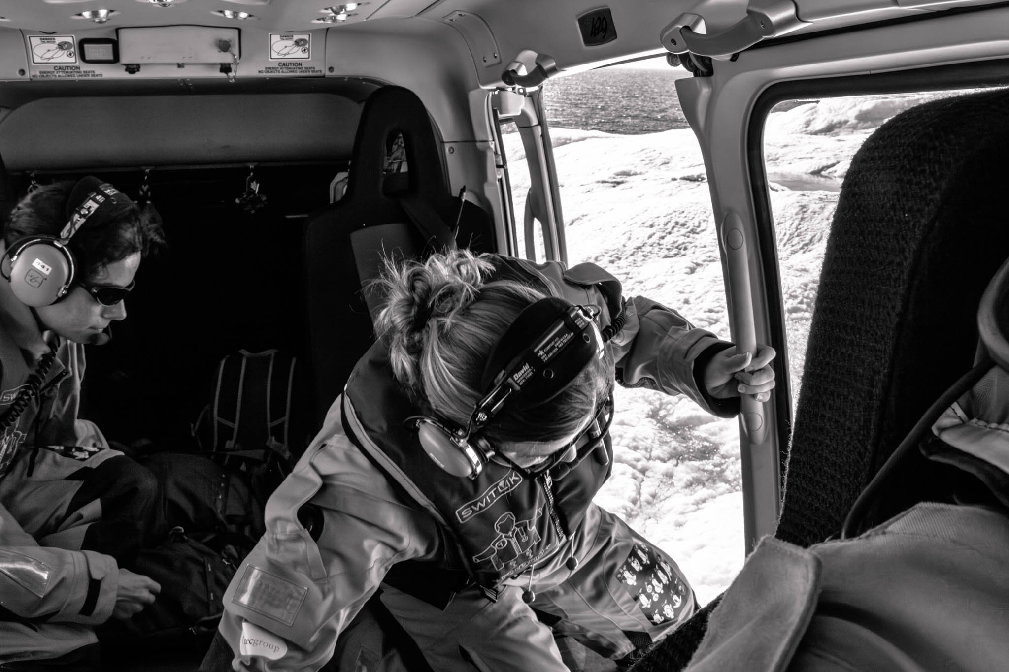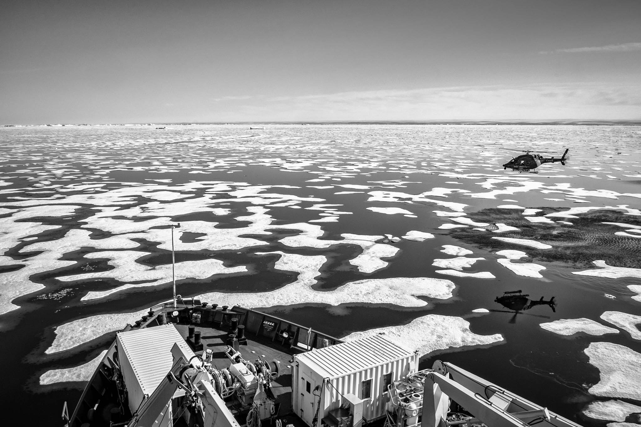 2 août 2017 — détroit de Lancaster. L’hélicoptère s’envole avec une équipe de glaciologues. Ils vont porter une balise sur un iceberg tabulaire à la dérive que le pilote survole plusieurs fois. Il choisit un endroit pour atterrir. La glaciologue Abigail Dalton dépose une balise sur un iceberg afin d’en suivre la dérive. Pendant que la scientifique reliée à l’hélico par un harnais descend déposer sa balise, le pilote reste en contrôle de l’appareil, prêt à décoller à la moindre secousse.