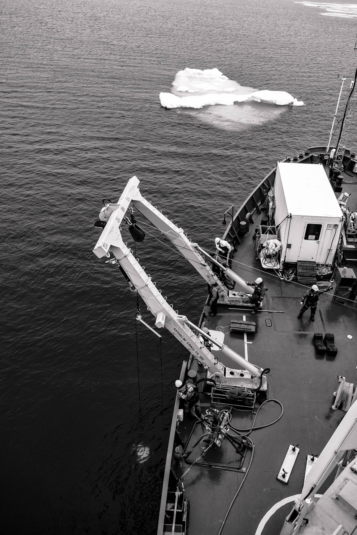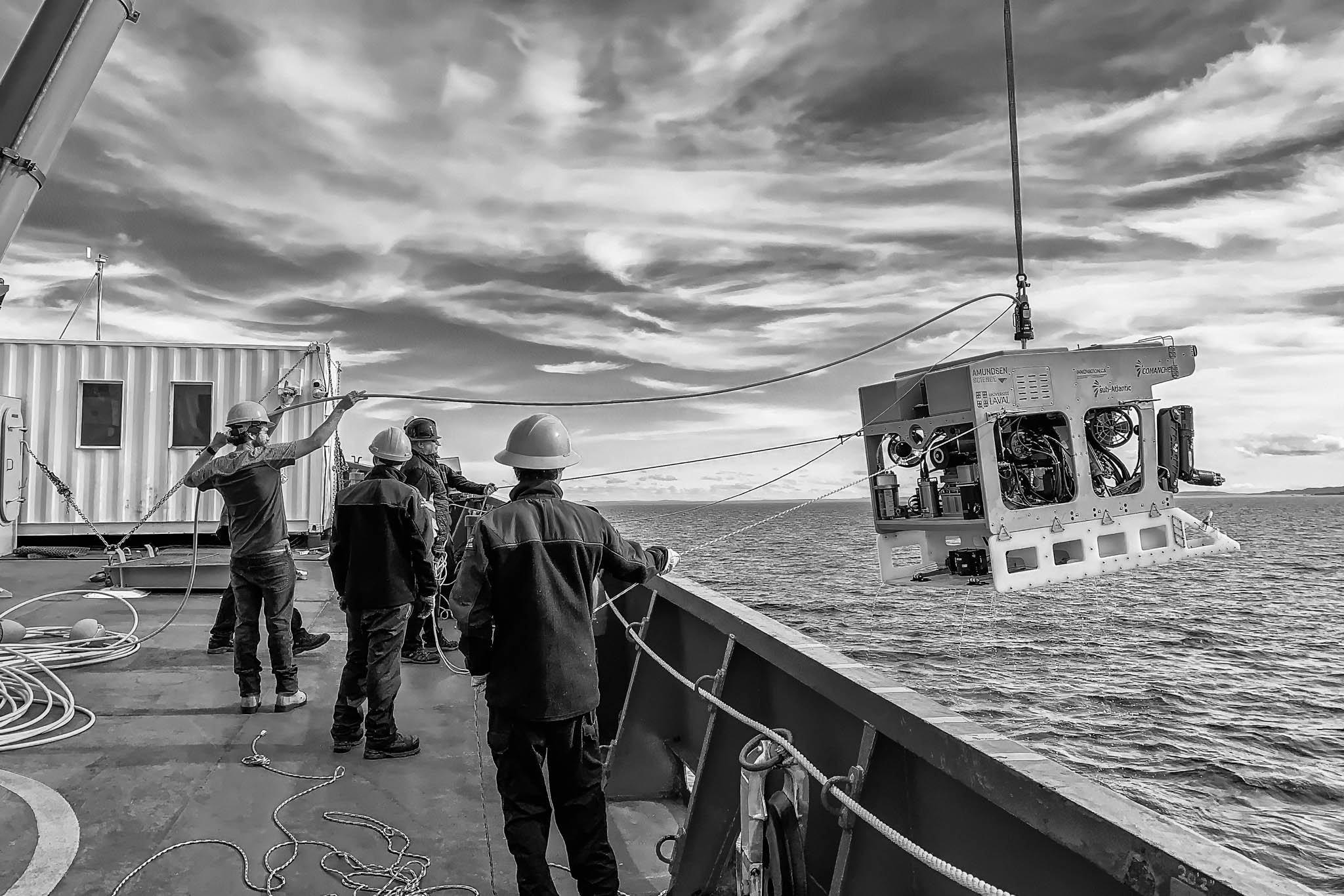 16 juillet 2021 - Mer de Baffin. Un véhicule sous-marin téléopéré Astrid (ROV), conçu pour les recherches scientifiques en milieu marin extrême, est déployé depuis le pont du NGCC Amundsen. Ce ROV, relié au navire par un câble ombilical, est équipé de caméras haute définition, de sonars et de bras manipulateurs, permettant de cartographier les fonds marins, d'étudier les écosystèmes benthiques et de prélever des échantillons biologiques et géologiques. Robuste et fiable, il est spécialement conçu pour résister aux conditions rigoureuses de l'Arctique, offrant aux chercheurs une fenêtre précieuse sur des environnements inaccessibles aux humains.