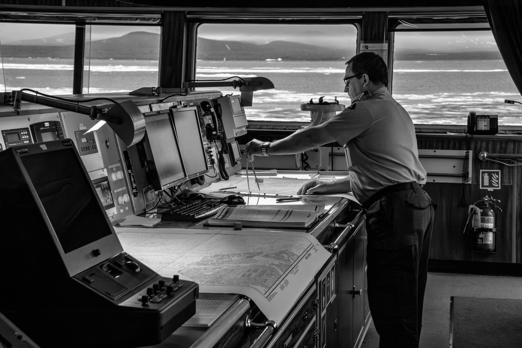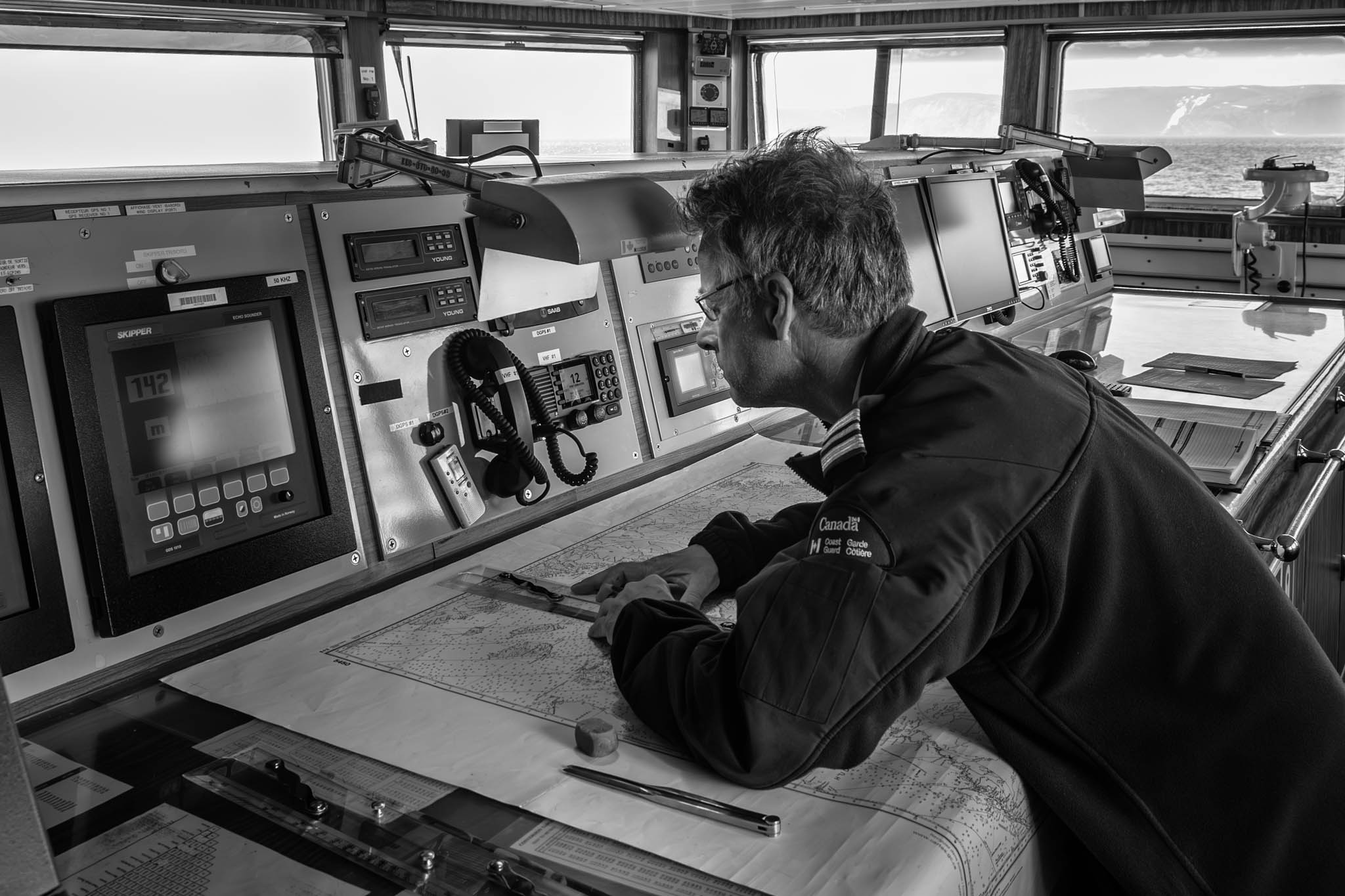10 juillet 2017 — détroit d’Hudson. Le 1er lieutenant Jocelyn Dugas calcule et planifie l’itinéraire sur les cartes marines. Les officiers de navigation d’expérience préfèrent les instruments traditionnels, comme les cartes, la règle et le compas pour leur fiabilité, car ils ne dépendent ni de l’électricité ni des satellites, ce qui les rend essentiels en cas de panne des systèmes électroniques. Ces outils offrent une meilleure compréhension des principes fondamentaux de la navigation et permettent une connexion physique et visuelle avec l’environnement, facilitant l’observation active des côtes, du ciel et des courants. Formés avec ces méthodes, les officiers ont acquis un savoir-faire pratique et une confiance qu’ils ne retrouvent pas toujours dans les technologies modernes. Enfin, ils insistent sur l’importance d’être prêt à gérer les situations d’urgence sans dépendre des appareils électroniques.