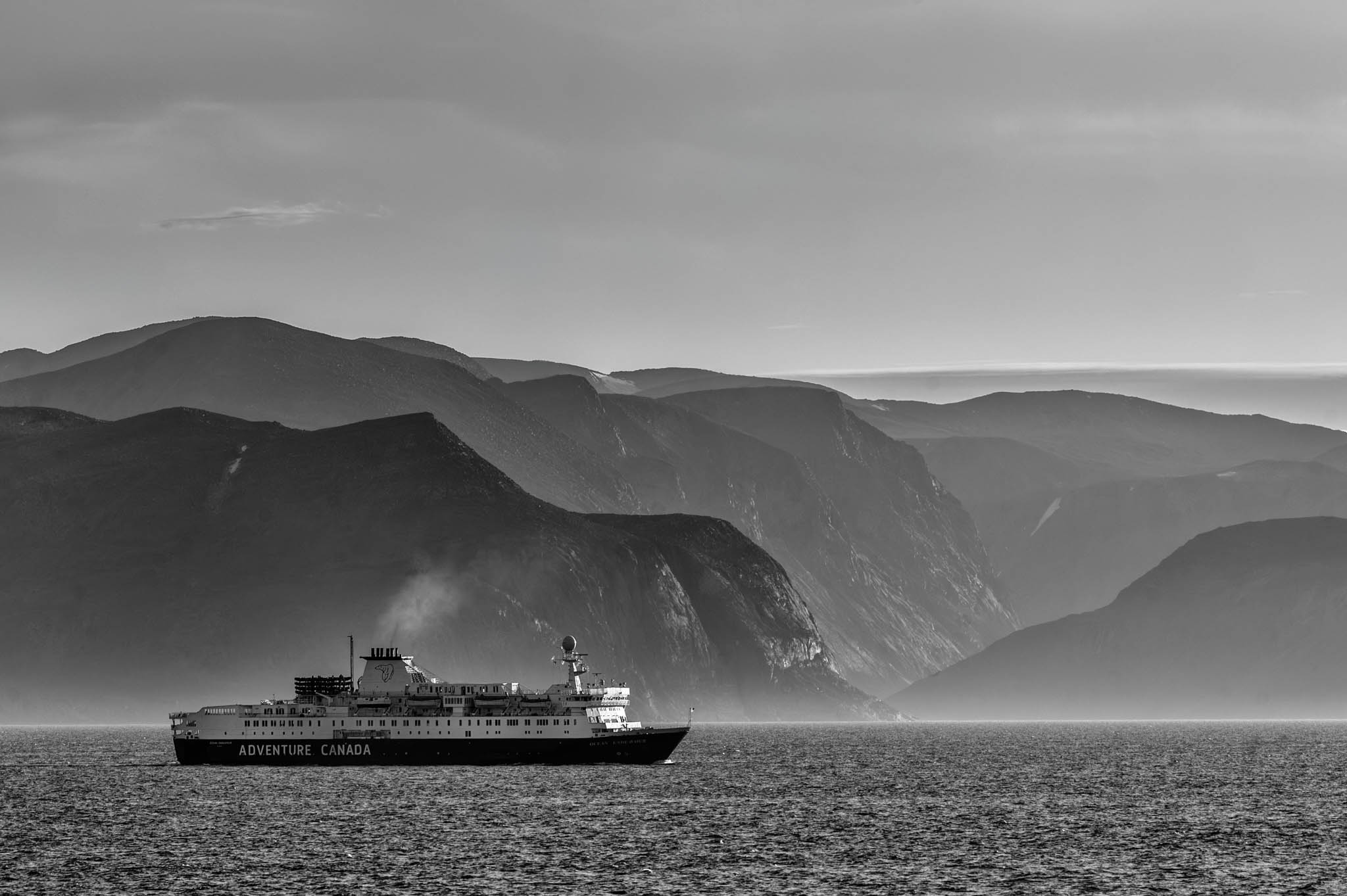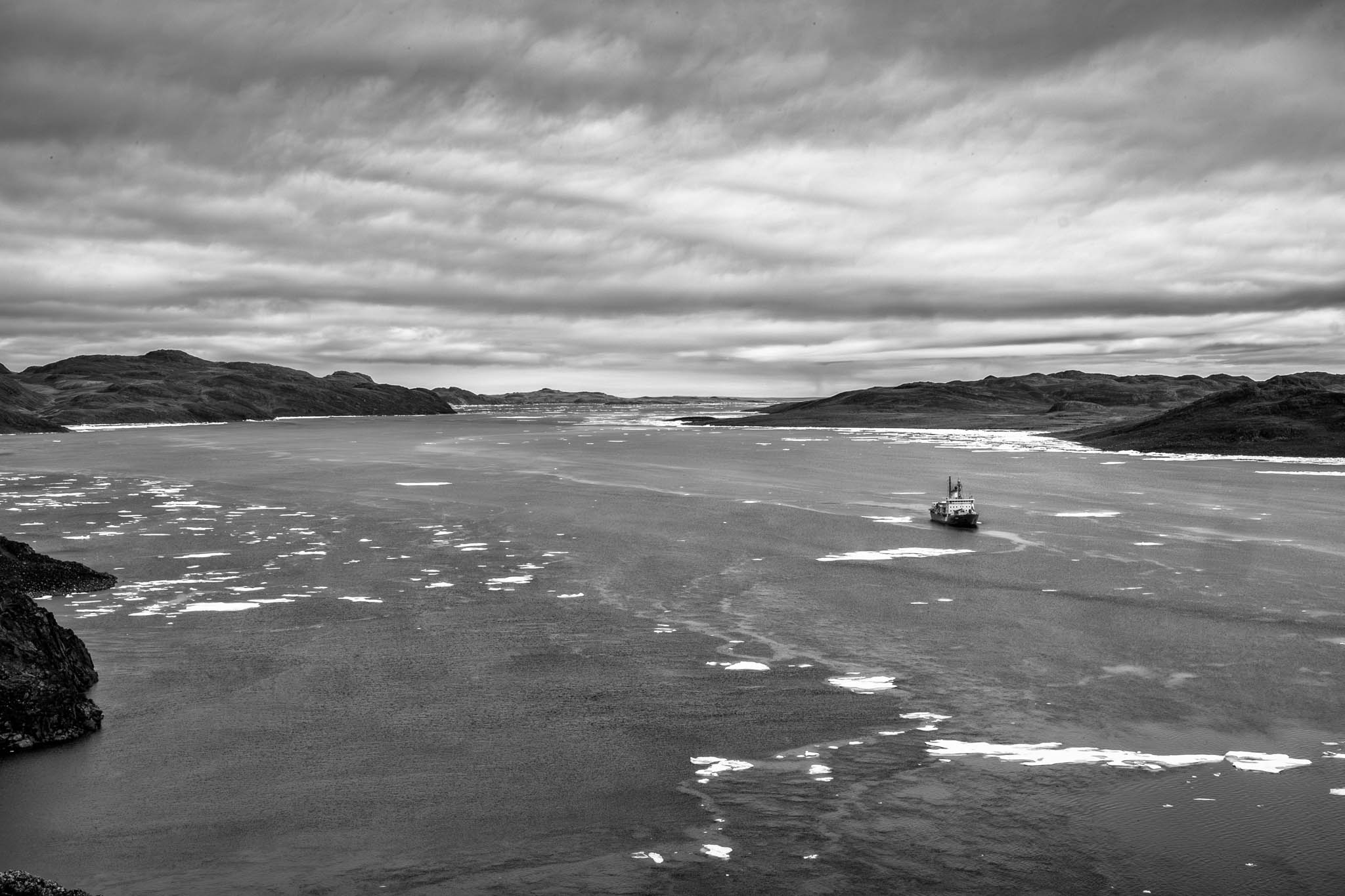 13 août 2019 - côtes de l'île de Baffin. Un navire de croisière longe les côtes de la Terre de Baffin en direction du Passage du Nord-Ouest. Avec la fonte des glaces, le nombre de croisières en Arctique a explosé, augmentant de près de 500 % en 15 ans, selon le Programme des Nations unies pour l’environnement. Malgré leur taille réduite (100 à 250 passagers), ces navires posent des défis logistiques et environnementaux. En 2010, le NGCC Amundsen a dû suspendre ses recherches pour secourir un navire échoué sur un rocher non répertorié dans le golfe du Couronnement, au Nunavut.