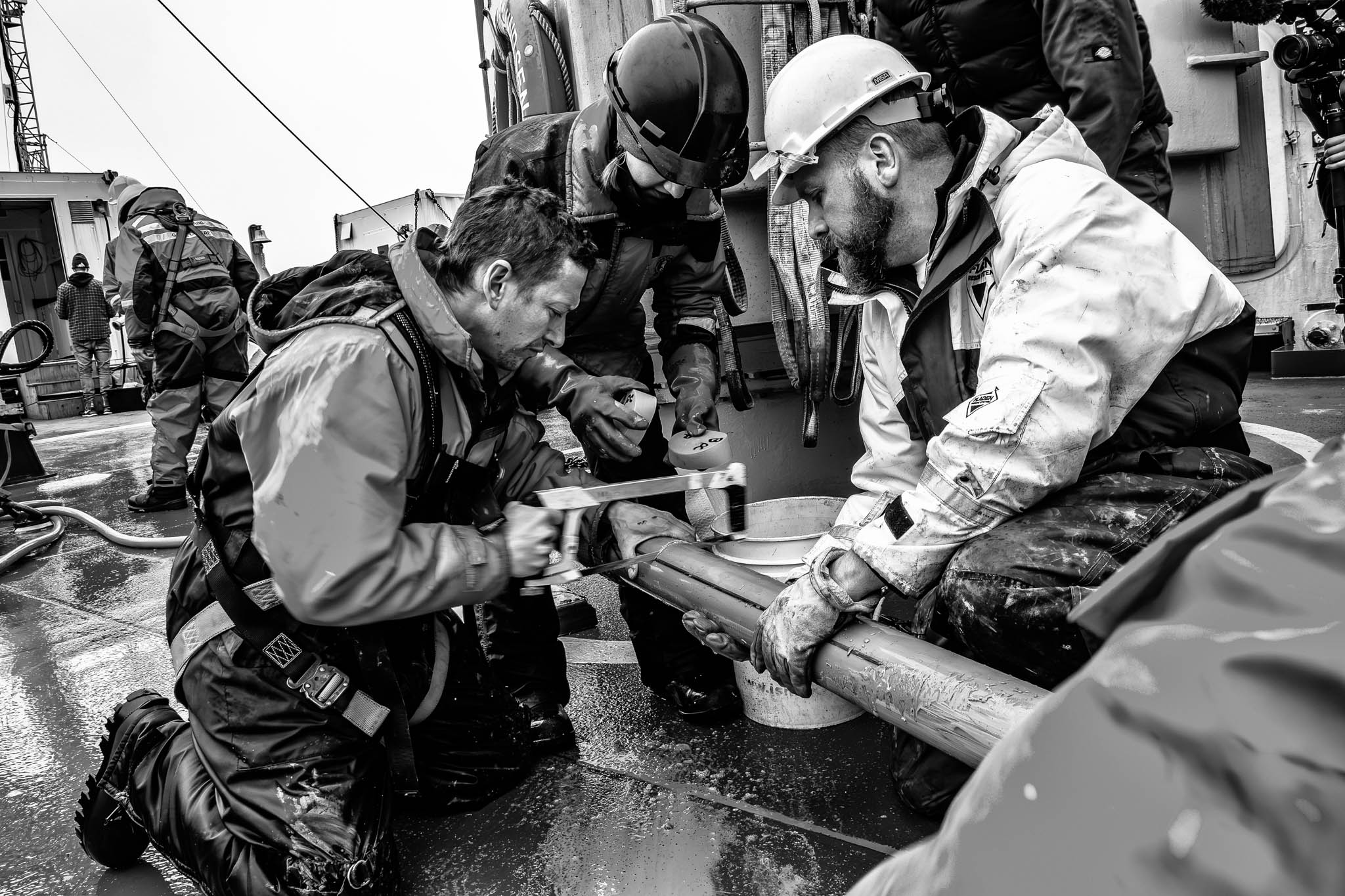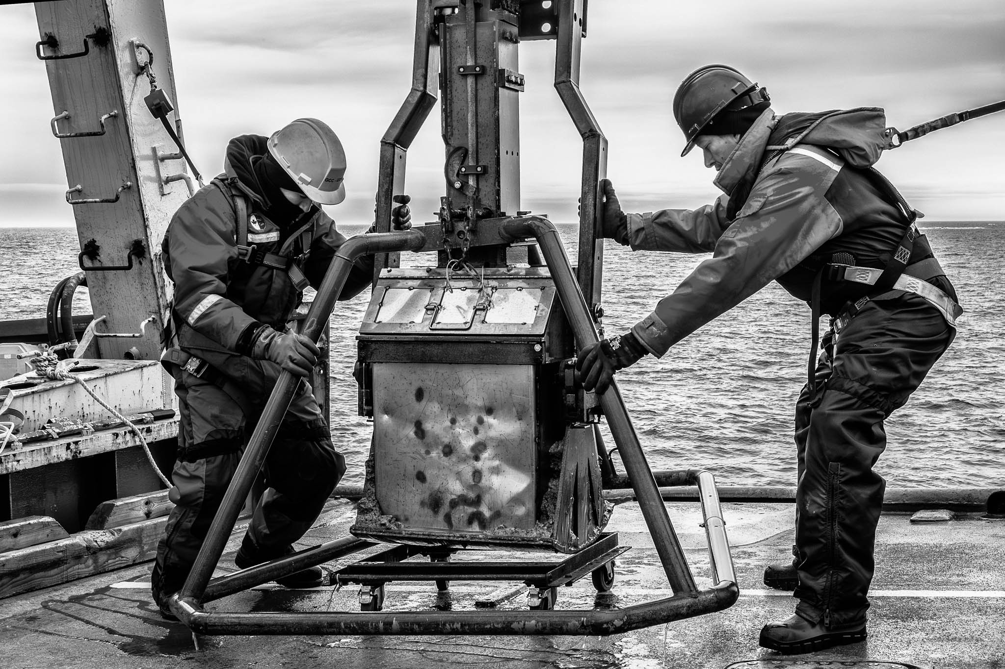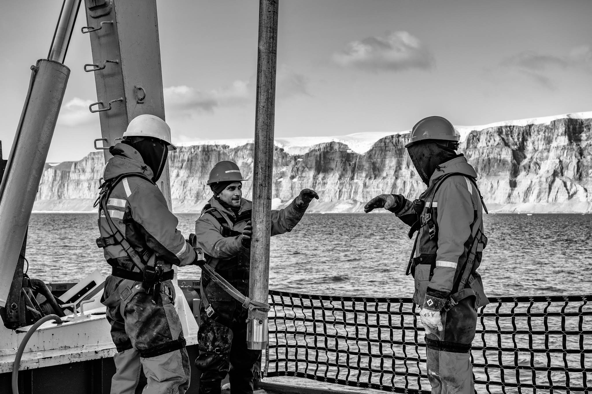 7 août 2021 - Fjord de Gibbs, Terre de Baffin, Nunavut, Canada. Préparation de la mise à l'eau d'un carottier à piston pour récupérer des sédiments à 303 mètres de profondeur. Ce dispositif, essentiel en géosciences marines, permet de prélever des échantillons cylindriques de sédiments en profondeur tout en conservant les couches stratifiées intactes. La procédure est menée sous les directives du quartier-maître Yannick Gagnon (casque rouge) et supervisée par le chef officier Jean Gaumond (casque blanc, à droite). Alexandre Normandeau, géoscientifique marin à l'Institut océanographique de Bedford, analyse ces carottes pour étudier les effets des changements climatiques sur l'évolution de la cryosphère et les géorisques marins, tels que les glissements sous-marins et les tsunamis qu'ils peuvent engendrer.