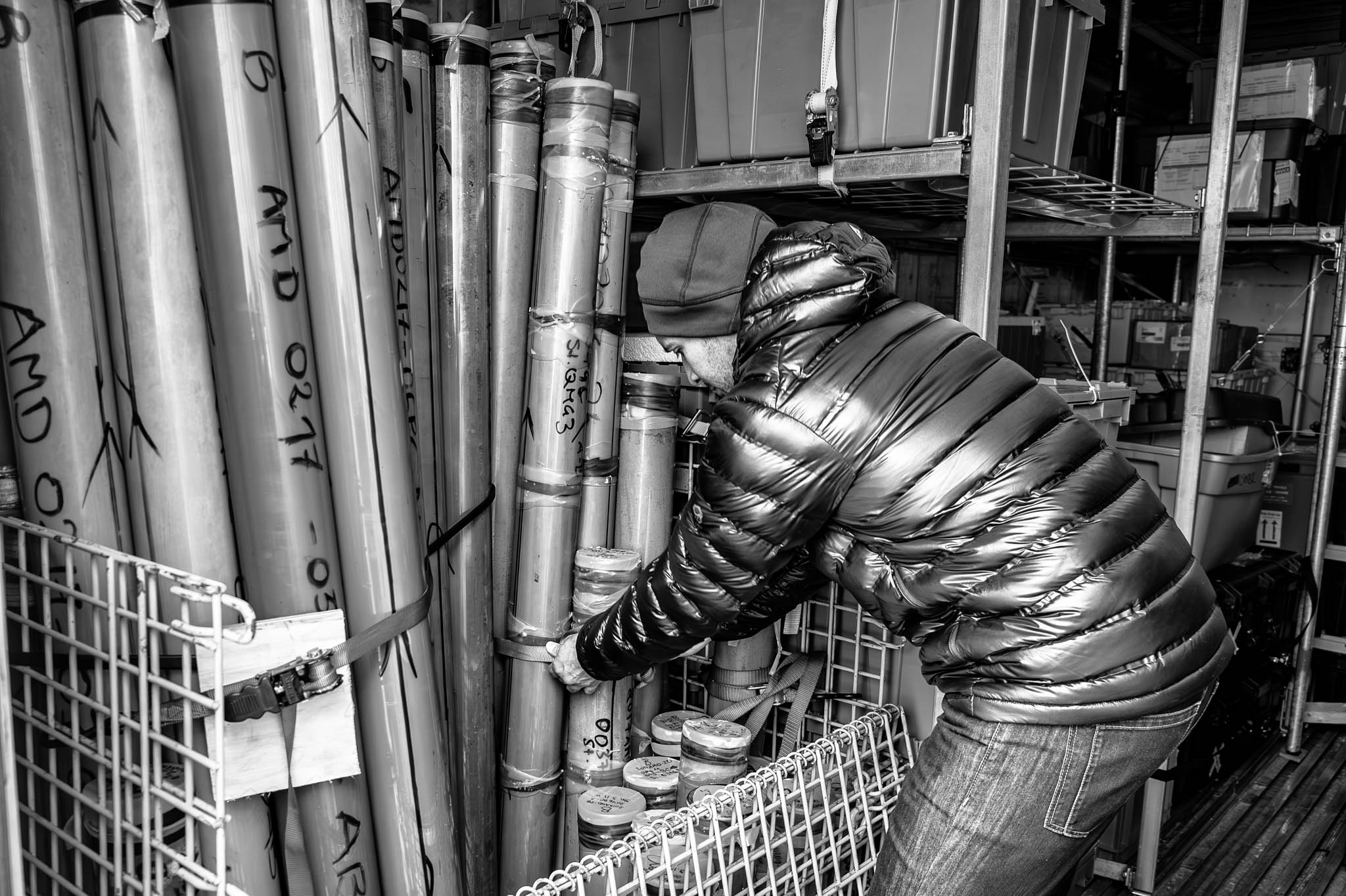 16 août 2017 — Passage du Nord-Ouest. Le professeur Jean-Carlos Montero-Serrano vérifie l’arrimage de ses échantillons de carottes en prévision d’une tempête à venir. Le réchauffement climatique provoque des changements rapides en Arctique, notamment la réduction de la couverture de glace, l’amincissement des glaciers et l’augmentation des températures. Ces transformations pourraient ouvrir le Passage du Nord-Ouest, une route maritime stratégique reliant l’Atlantique à l’Asie, ce qui entraînerait une hausse du trafic maritime et des activités économiques. Toutefois, ces développements risquent d’affecter l’environnement fragile de l’Arctique. Selon le professeur Montero-Serrano, il est crucial d’établir un état initial des sédiments marins, encore peu étudiés, afin de mieux évaluer les impacts futurs de cette circulation accrue.