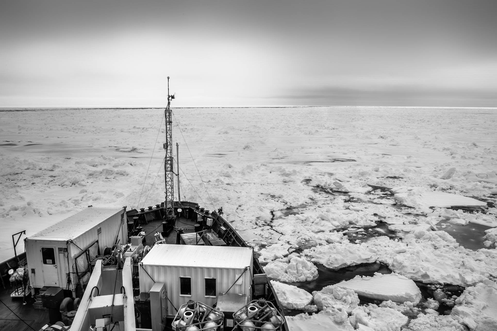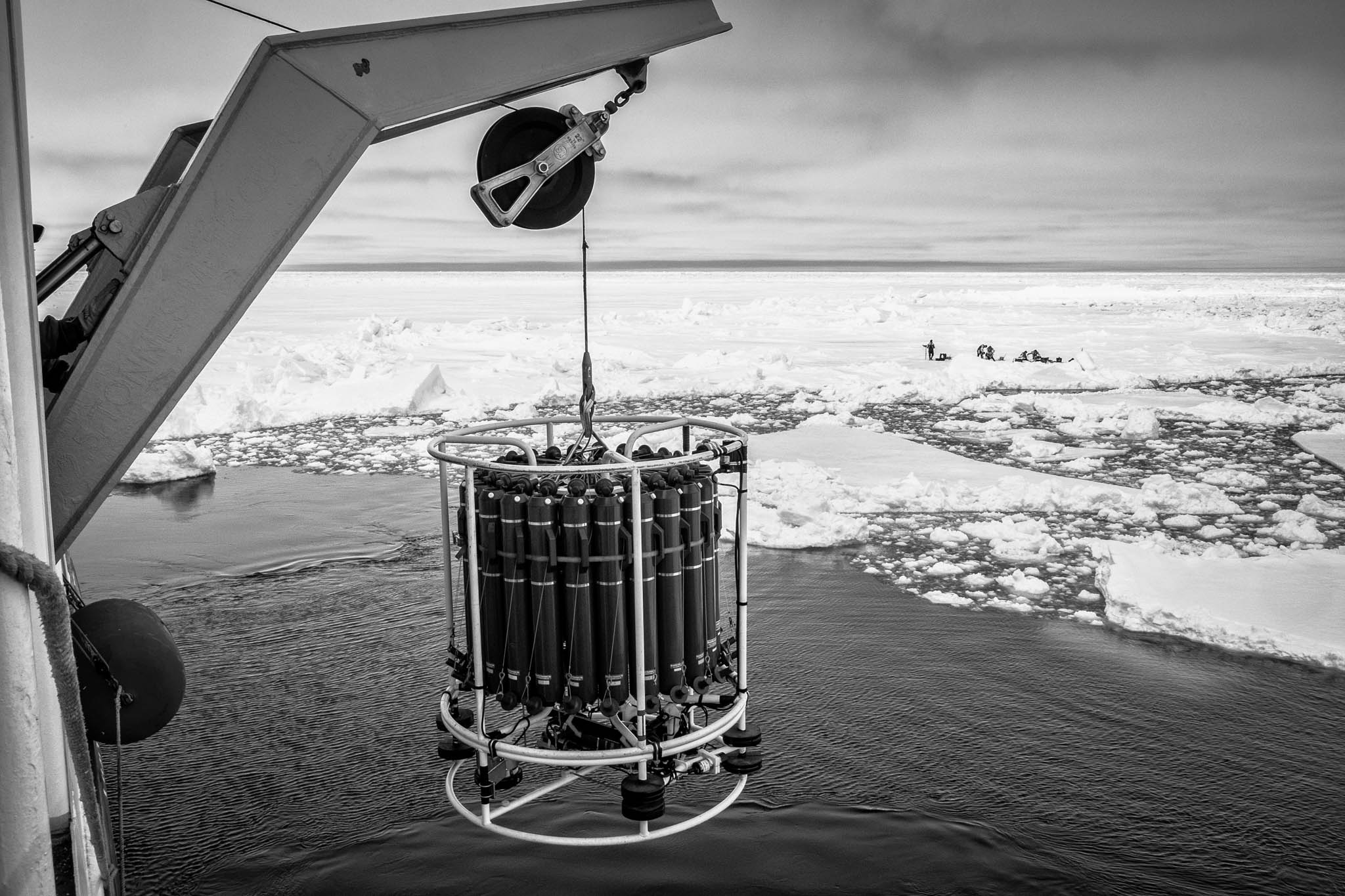 25 mai 2018 - baie d'Hudson. La rosette est déployée depuis le pont du navire, avec une équipe de glace à l'arrière-plan, sur la banquise. Une rosette est un tonneau métallique transportant des bouteilles d'échantillonnage télécommandées et des sondes mesurant l'oxygène, le pH, la température, la salinité et la teneur en chlorophylle. Les bouteilles sont ouvertes à différentes profondeurs le long de la descente de la rosette. La surveillance à intervalles réguliers permet de détecter les changements de l'écosystème, de les relier aux changements climatiques observés et de faire des projections.