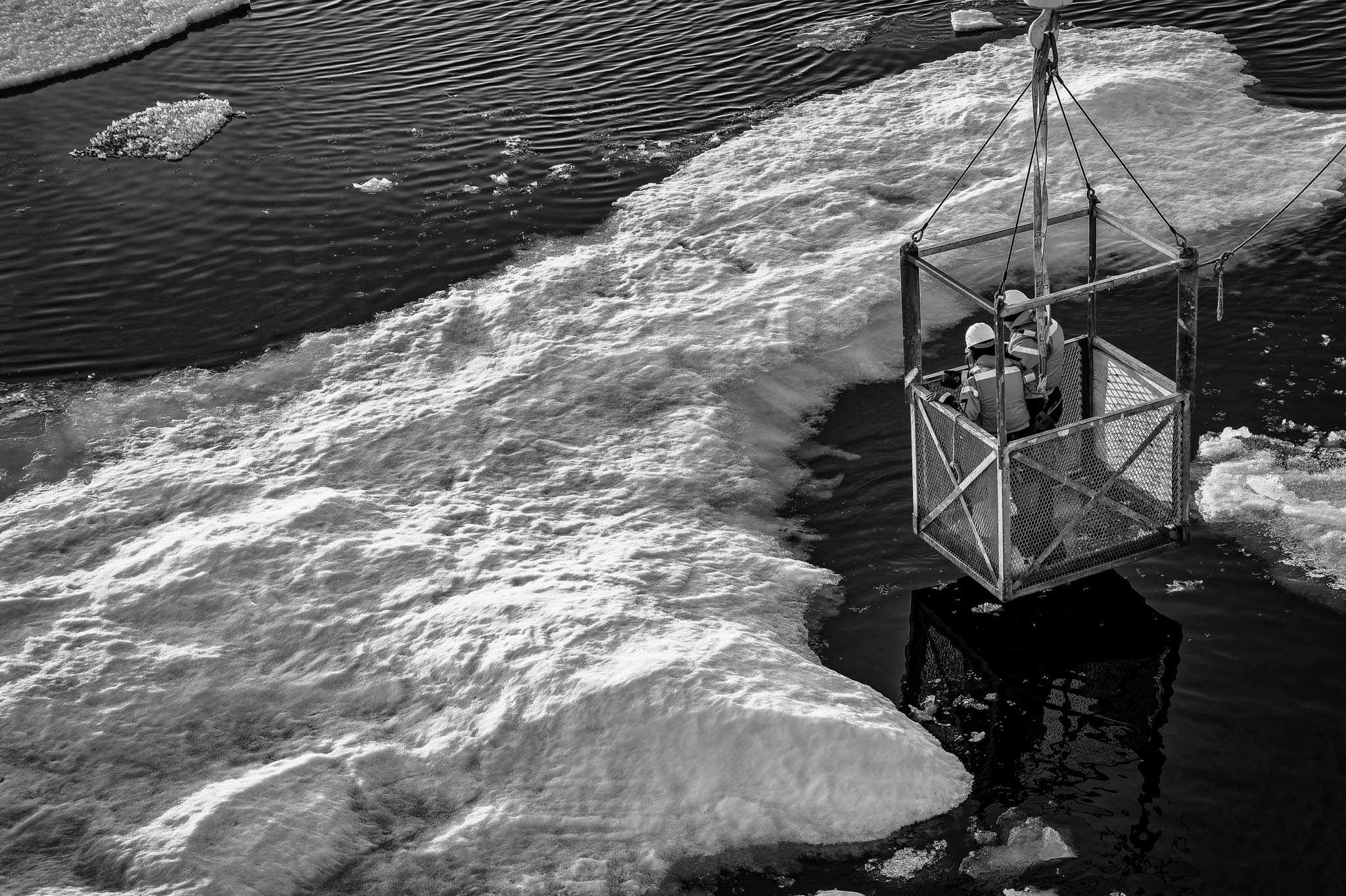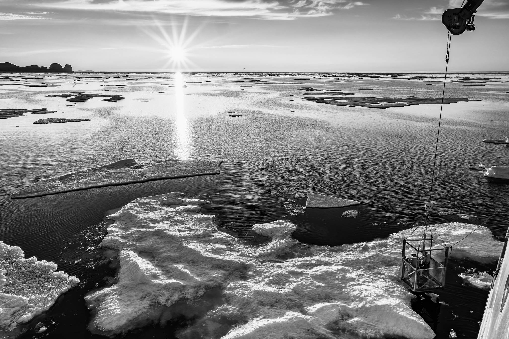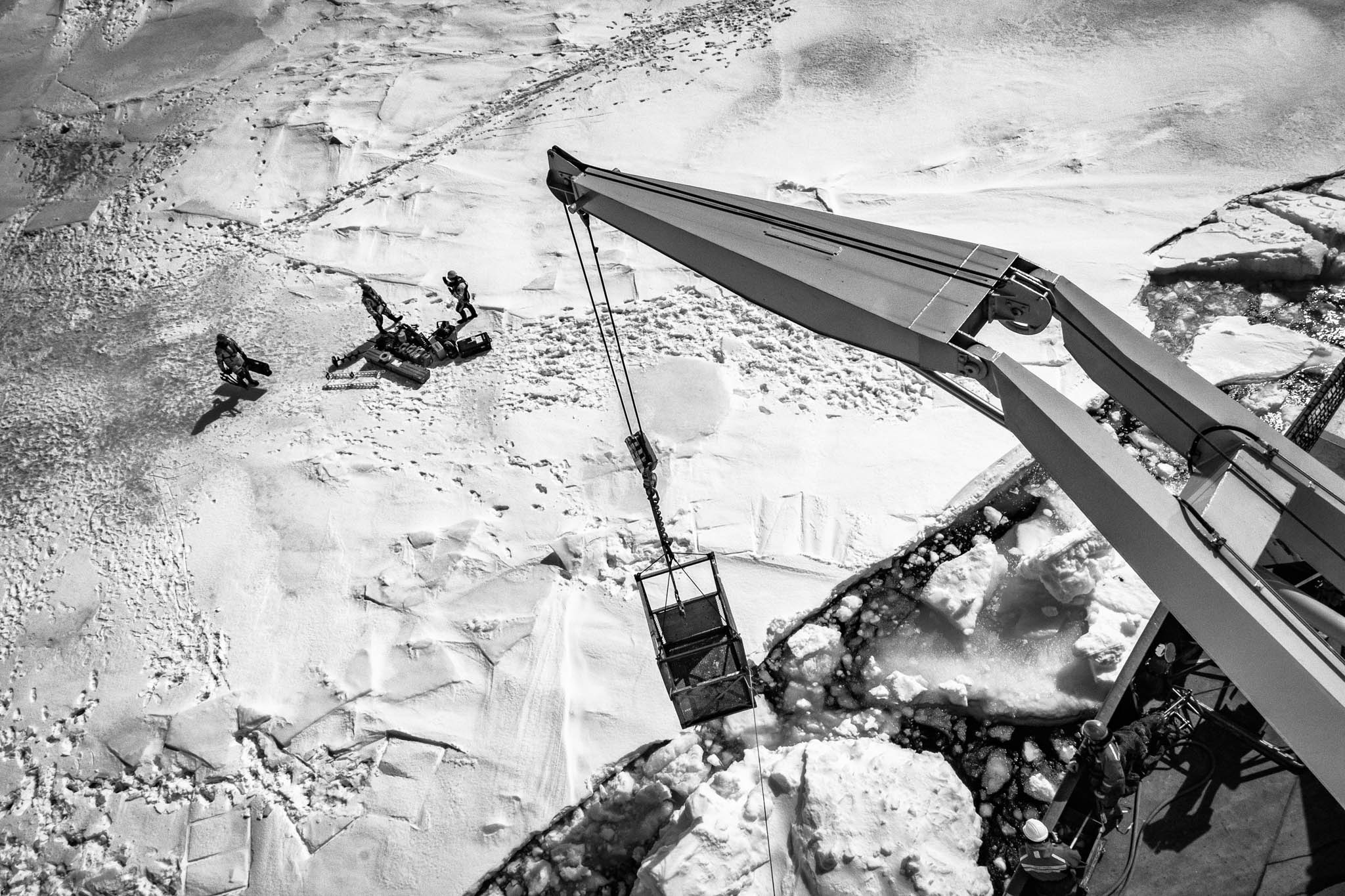24 mai 2018 — baie d’Hudson. Un groupe de scientifiques vient d’être déposé sur la banquise à l’aide d’un panier suspendu à une des grues de l’Amundsen.