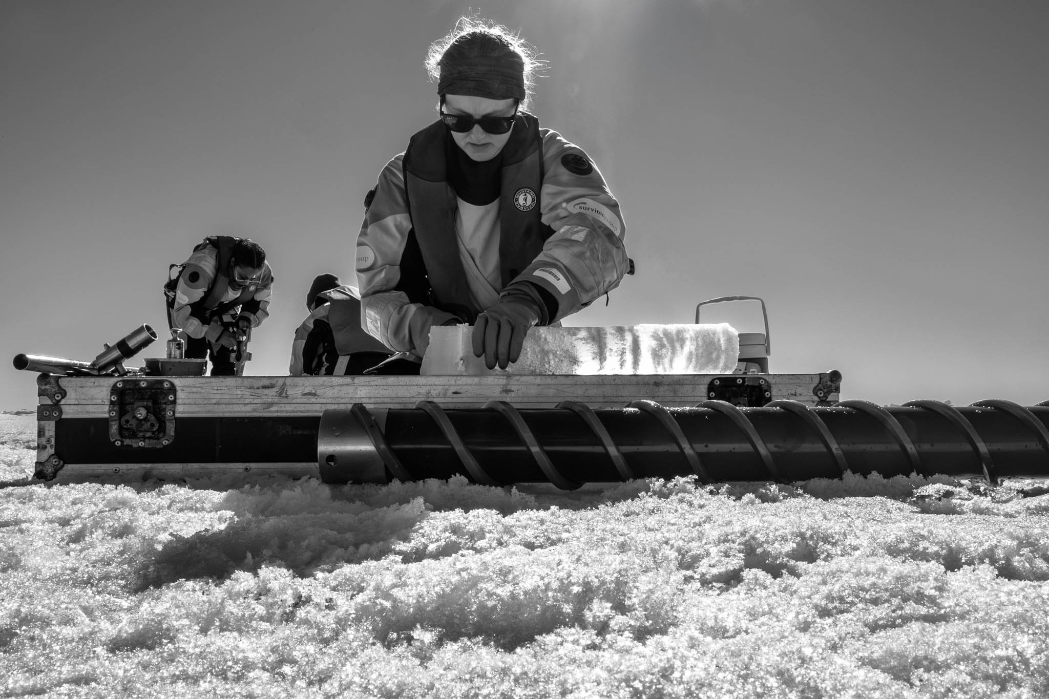 3 juin 2018 — banquise de la baie d’Hudson. Laura Dalman recueille une carotte de glace de mer afin de garder la partie inférieure de la banquise et étudier le développement des algues qui s’y trouvent dans le cadre du projet BaySys. Les algues de glace, qui se développent dans les interstices de la glace de mer, jouent un rôle essentiel dans la production primaire de l’océan Arctique à la fin de l’hiver et au printemps. Cette étude révèle que les courants sous-glaciaires augmentent l’apport de nutriments à la glace de fond, favorisant ainsi une plus grande biomasse d’algues. En revanche, les apports d’eau douce, notamment issus des rivières, réduisent la salinité et ont un impact négatif sur cette biomasse. Ces découvertes permettent d’identifier de nouveaux points chauds biologiques en Arctique et soulignent une influence limitée, mais notable, des débits des rivières contrôlées par des barrages hydroélectriques pendant l’hiver.