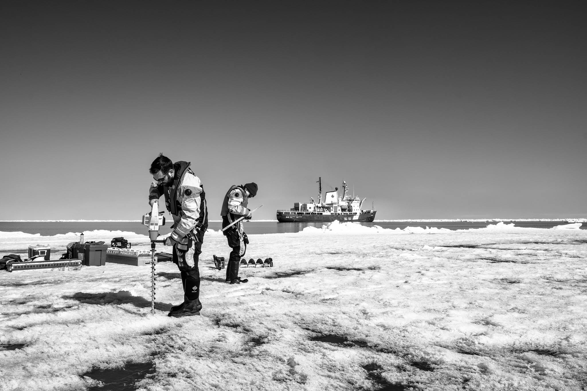 3 juin 2018 — banquise de la baie d’Hudson. David Babb perce des trous à différents endroits pour en mesurer l’épaisseur. David Babb est associé de recherche sous la direction de David Barber. À ce titre, il dirige certaines des recherches sur la glace de mer menées à bord de l’Amundsen et dans le cadre plus large du projet BaySys. Au cours de l’expédition, il prélève des carottes de glace, mesure l’épaisseur de la glace, déploie des balises de glace et prélève des échantillons d’eau directement sous la glace. Le projet BaySys vise à comprendre l’impact des changements climatiques et des activités humaines sur la baie d’Hudson et son écosystème. Il analyse les interactions entre l’apport d’eau douce provenant des rivières, la circulation océanique, la glace de mer et la productivité biologique afin d’évaluer la vulnérabilité de cette région face aux perturbations environnementales.