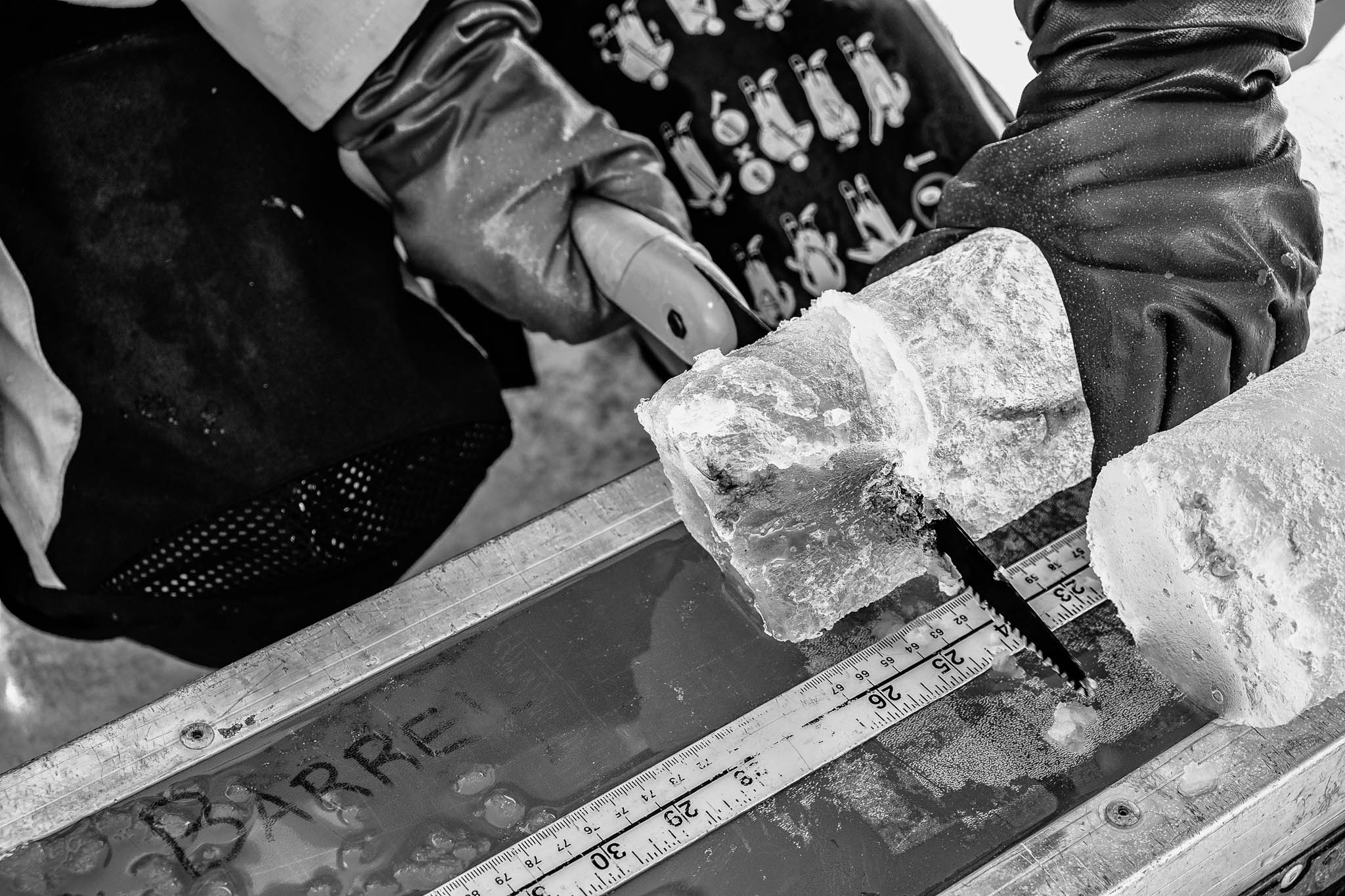 3 juin 2018 — banquise de la baie d’Hudson. Laura Dalman découpe une carotte de glace de mer afin de garder la partie inférieure de la banquise et étudier le développement des algues qui s’y trouvent dans le cadre du projet BaySys. Les algues de glace, qui se développent dans les interstices de la glace de mer, jouent un rôle essentiel dans la production primaire de l’océan Arctique à la fin de l’hiver et au printemps. Cette étude révèle que les courants sous-glaciaires augmentent l’apport de nutriments à la glace de fond, favorisant ainsi une plus grande biomasse d’algues. En revanche, les apports d’eau douce, notamment issus des rivières, réduisent la salinité et ont un impact négatif sur cette biomasse. Ces découvertes permettent d’identifier de nouveaux points chauds biologiques en Arctique et soulignent une influence limitée, mais notable, des débits des rivières contrôlées par des barrages hydroélectriques pendant l’hiver.