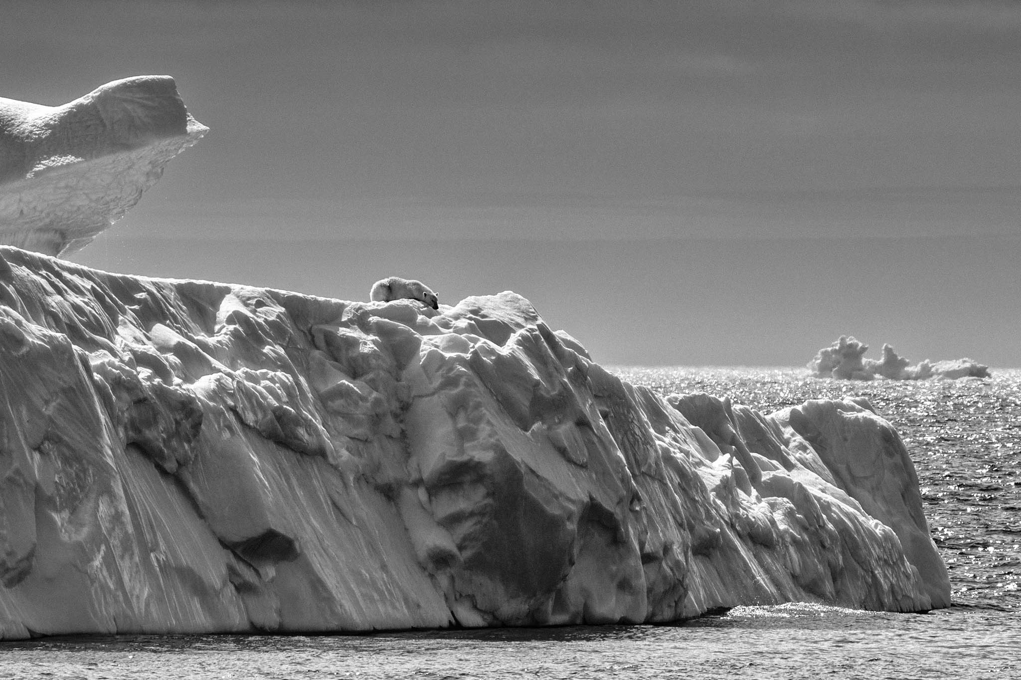 6 juillet 2019 — Mer de Baffin. Un ours polaire se repose sur un iceberg, entouré d’une mer sans glace, symbole frappant des impacts du réchauffement climatique. La fonte rapide de la banquise, essentielle pour la chasse aux phoques, prive les ours polaires de leur habitat et de leur principale source de nourriture, les forçant à jeûner plus longtemps. Les scientifiques s’accordent à dire que le changement climatique représente la plus grande menace pour cette espèce vulnérable, affectant sa santé, sa reproduction et la survie des oursons. Toutefois, les Inuit, témoins de ces transformations, observent des changements dans les comportements de chasse des ours.