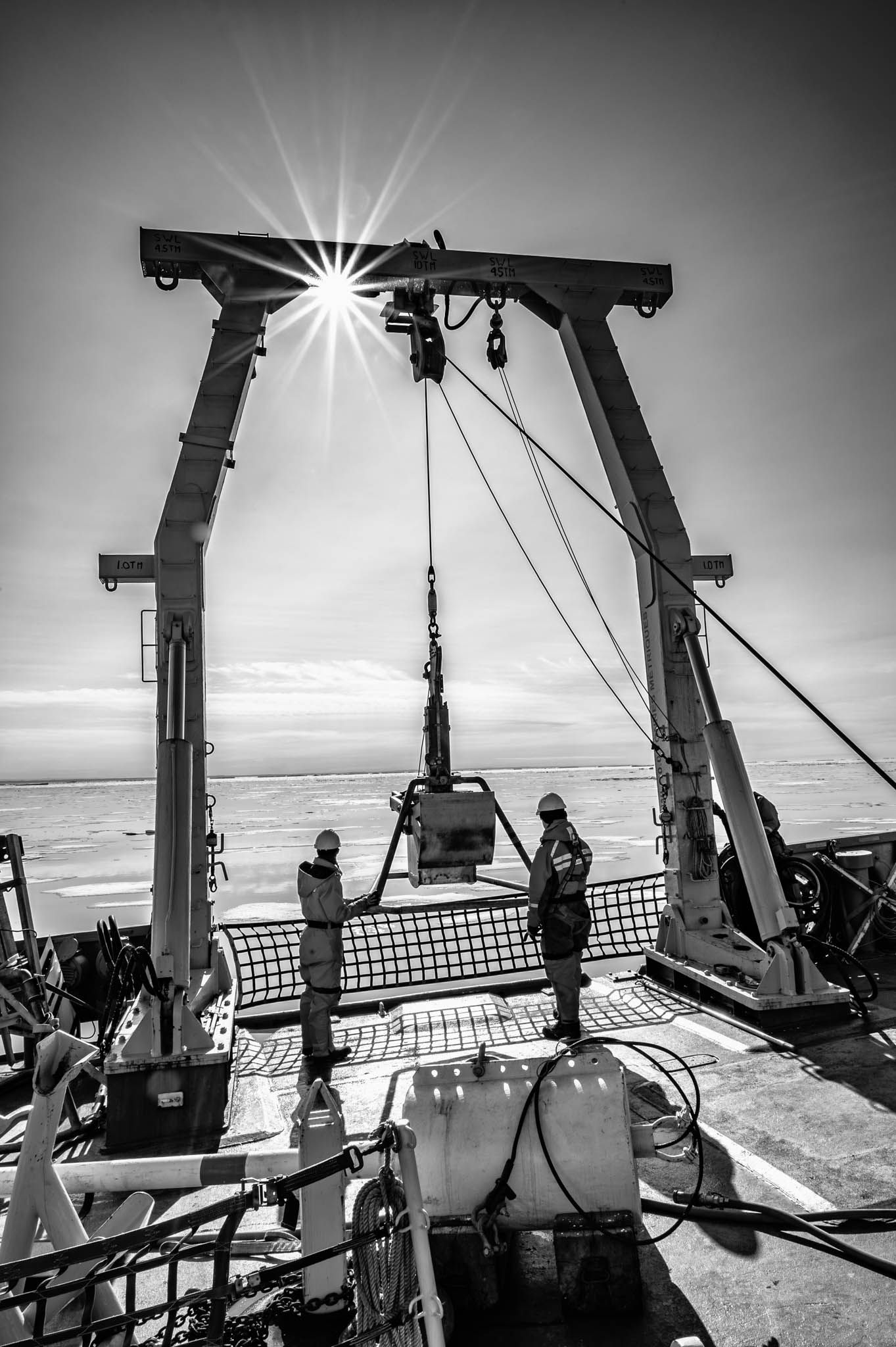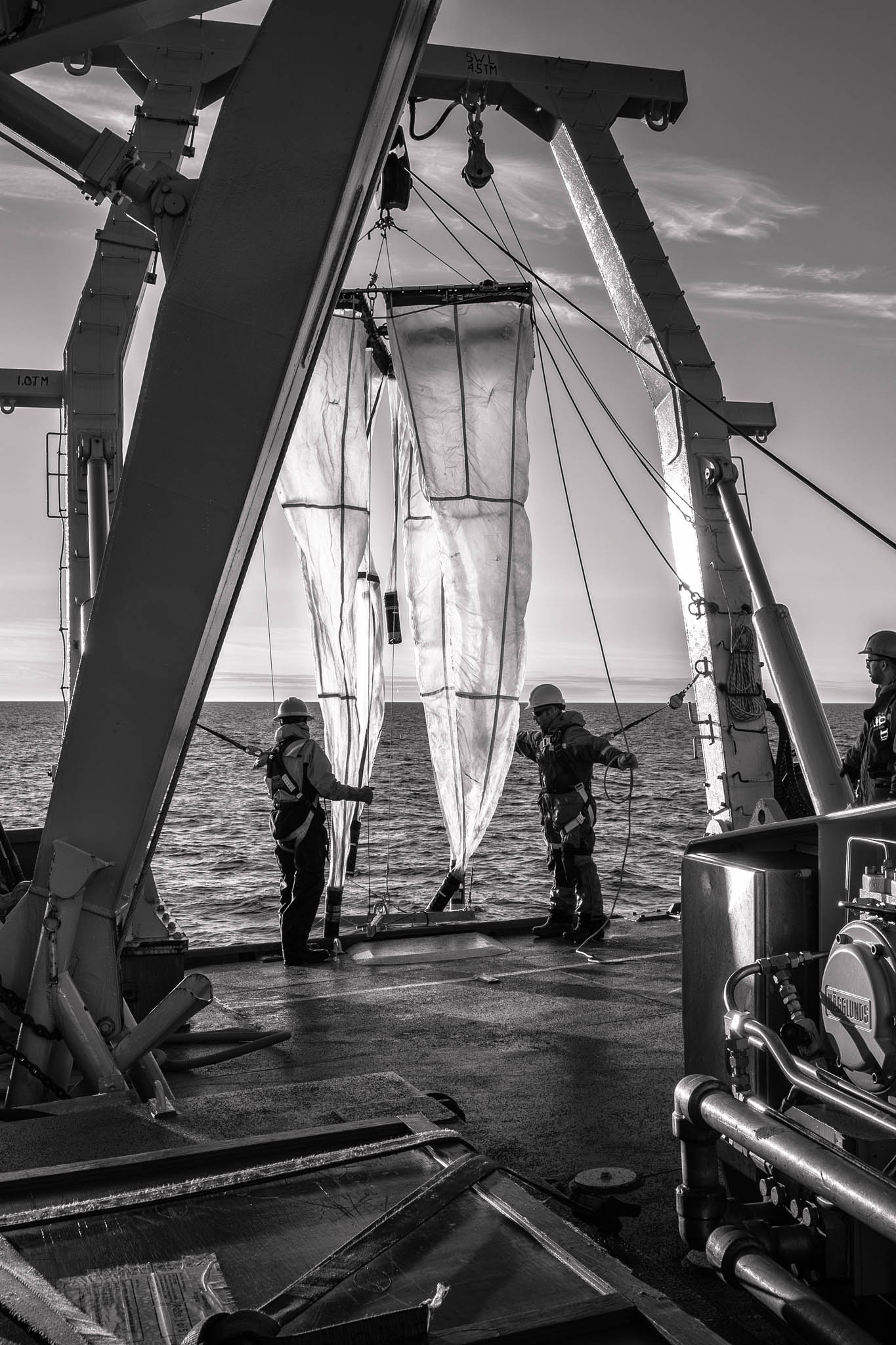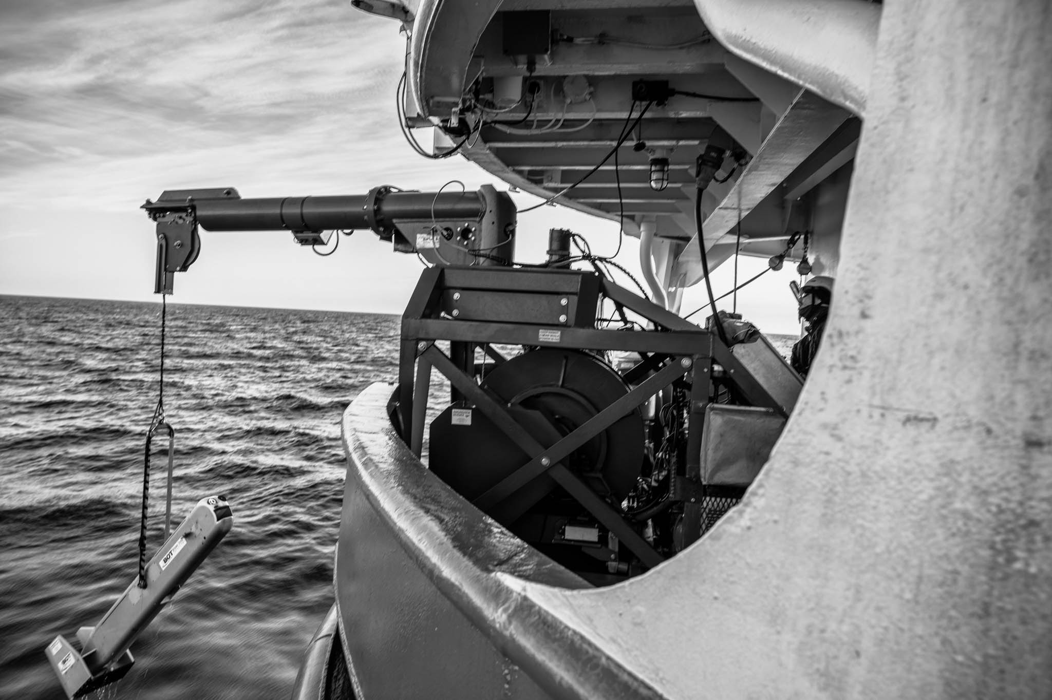 7 juillet 2017 — baie d’Hudson. Déploiement du chalut rectangulaire sur le NGCC Amundsen. Le chalut rectangulaire de demi-fond (RMT) est utilisé pour échantillonner les poissons et le zooplancton de grande taille horizontalement à une profondeur donnée dans la colonne d’eau. Surveiller les poissons et le zooplancton de grande taille dans les eaux de l’Arctique est essentiel pour évaluer l’impact des changements climatiques, comprendre les dynamiques de la chaîne alimentaire, assurer une gestion durable des ressources halieutiques, et protéger la biodiversité fragile de cette région unique. Cela permet également d’anticiper des changements à l’échelle mondiale en raison du rôle central que joue l’Arctique dans la régulation climatique.