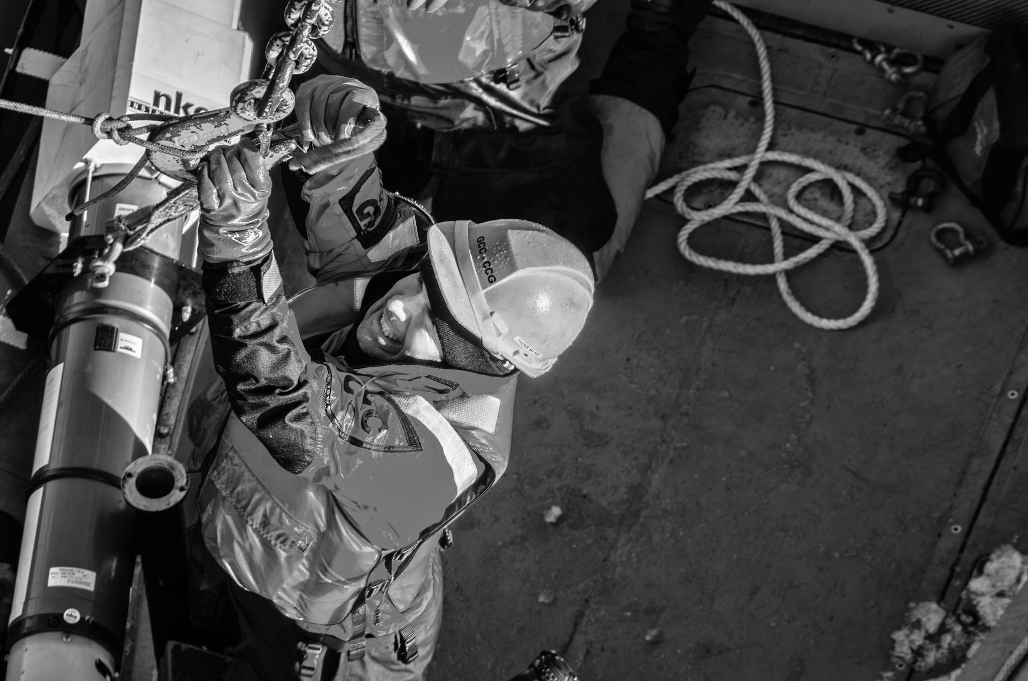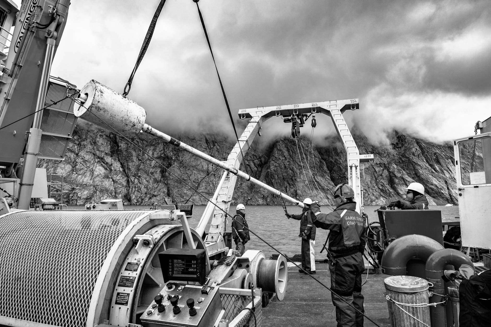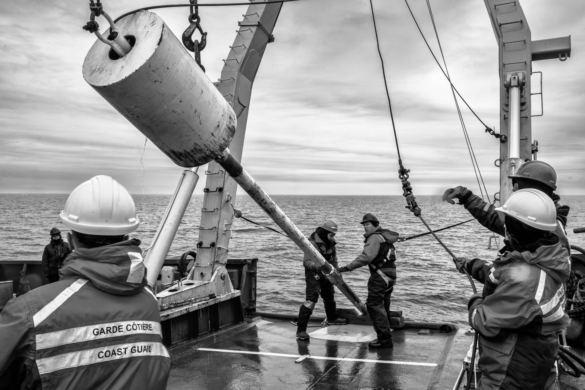 15 août 2017 - Passage du Nord-Ouest, Nunavut, Canada. Le professeur Jean-Carlos Montero Serrano et le technicien Pascal Rioux déploient, avec l'assistance des matelots du NGCC Amundsen, le carottier à piston de 10 mètres et 2000 kg, une opération complexe nécessitant plusieurs heures et une précision absolue. Ce mastodonte permet de prélever de longues carottes sédimentaires pouvant remonter jusqu’à 15 000 ans d’histoire, selon le taux d’accumulation des sédiments