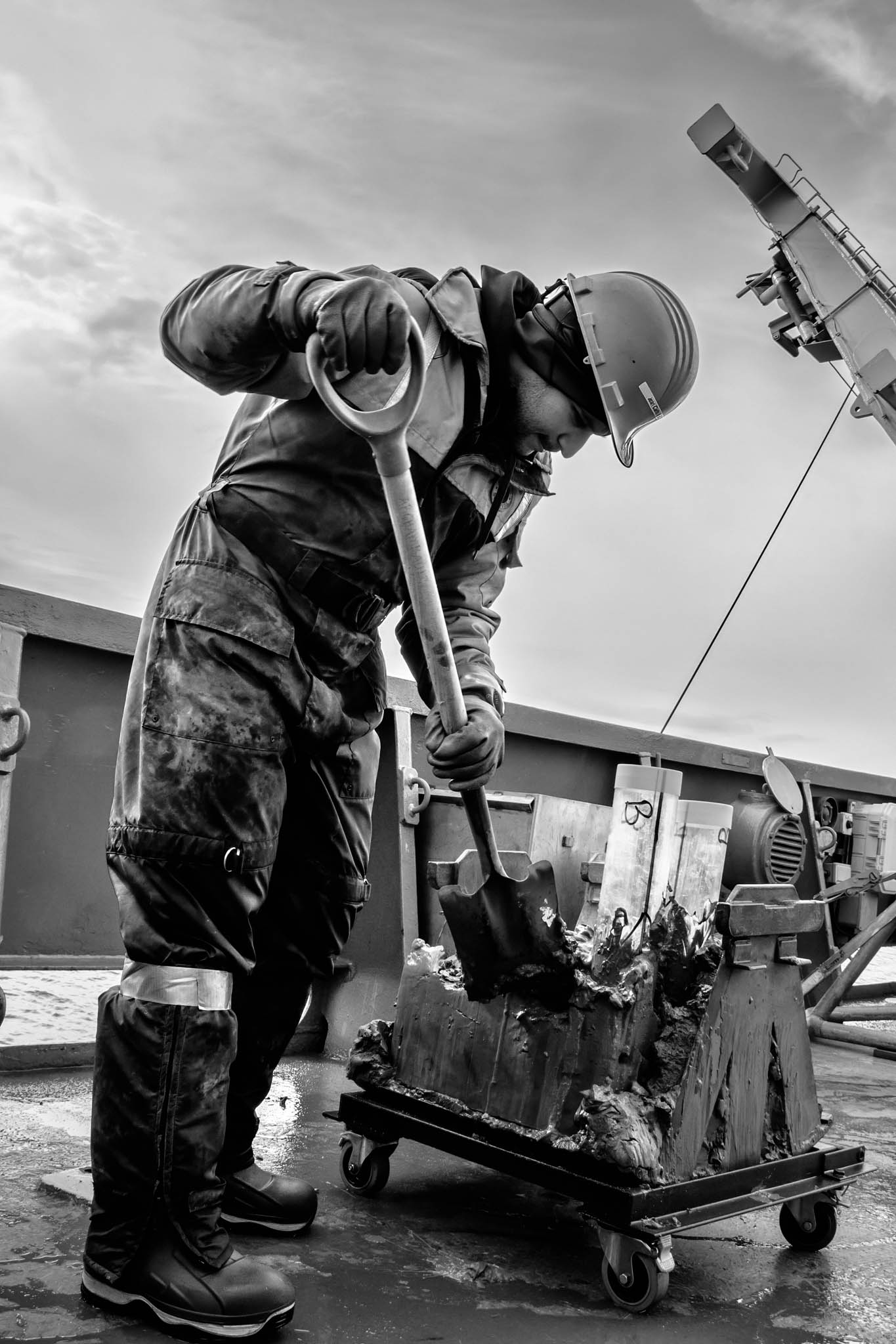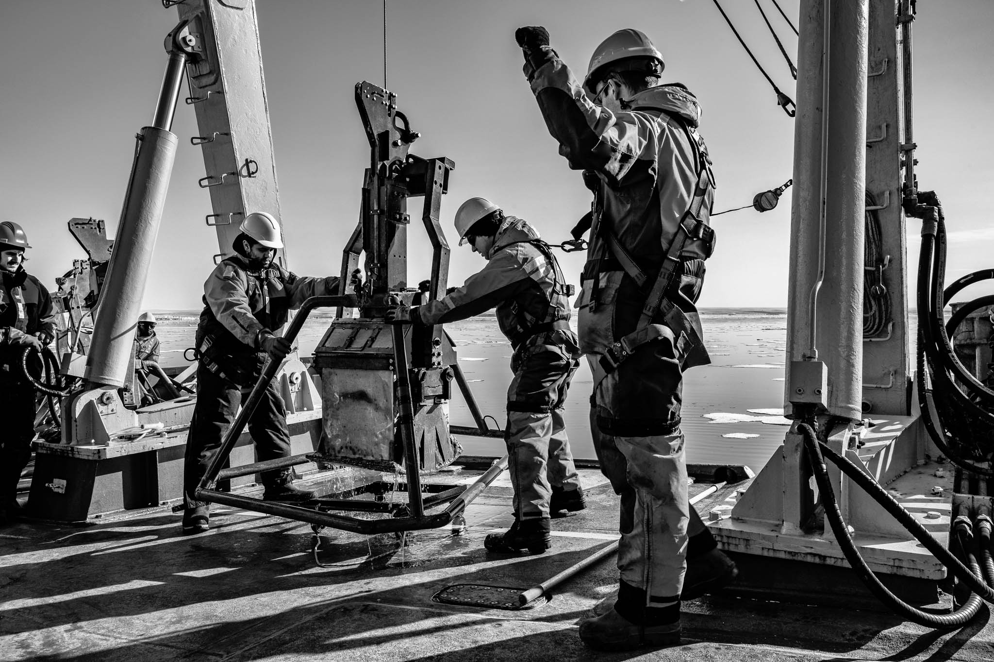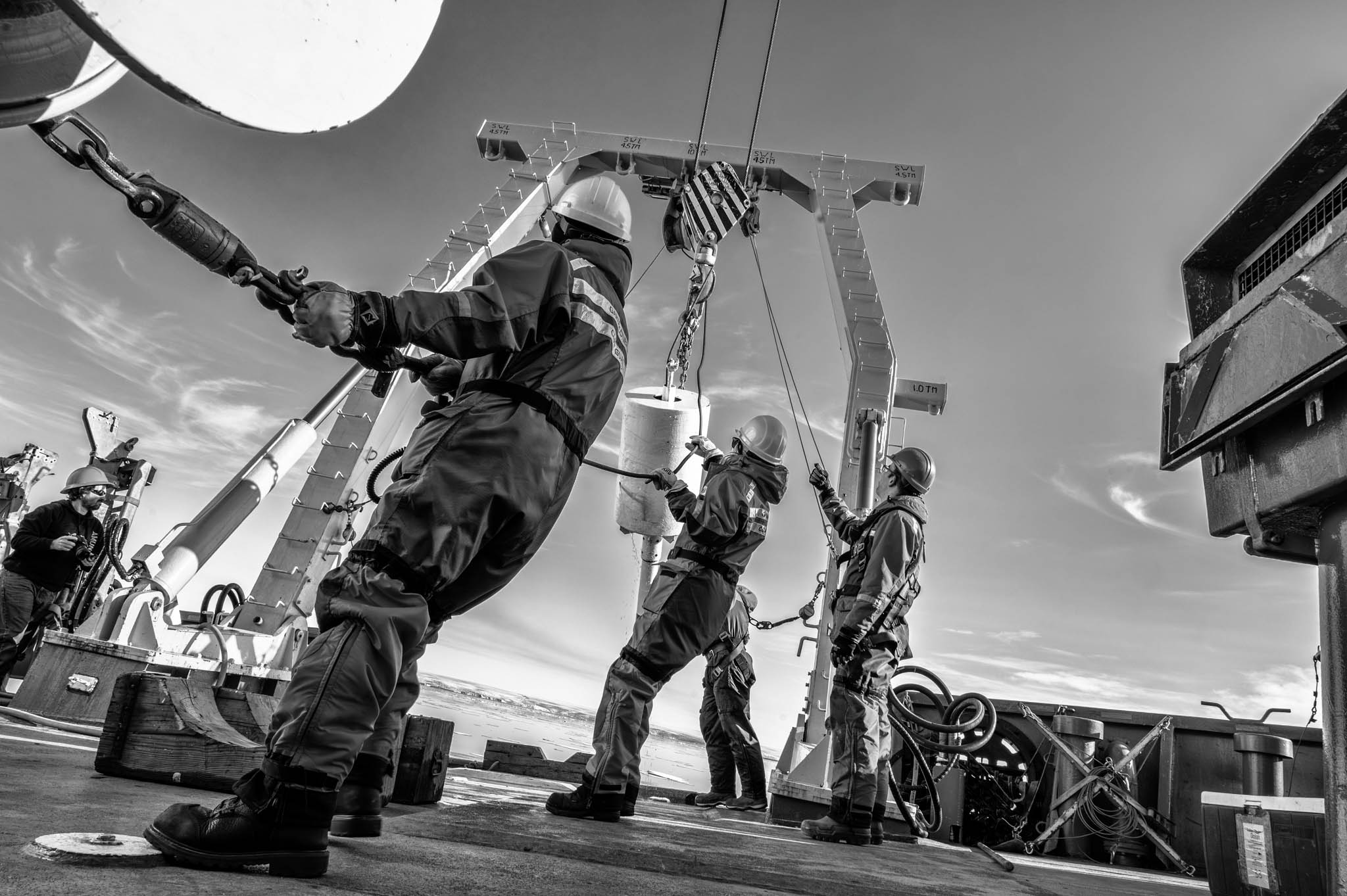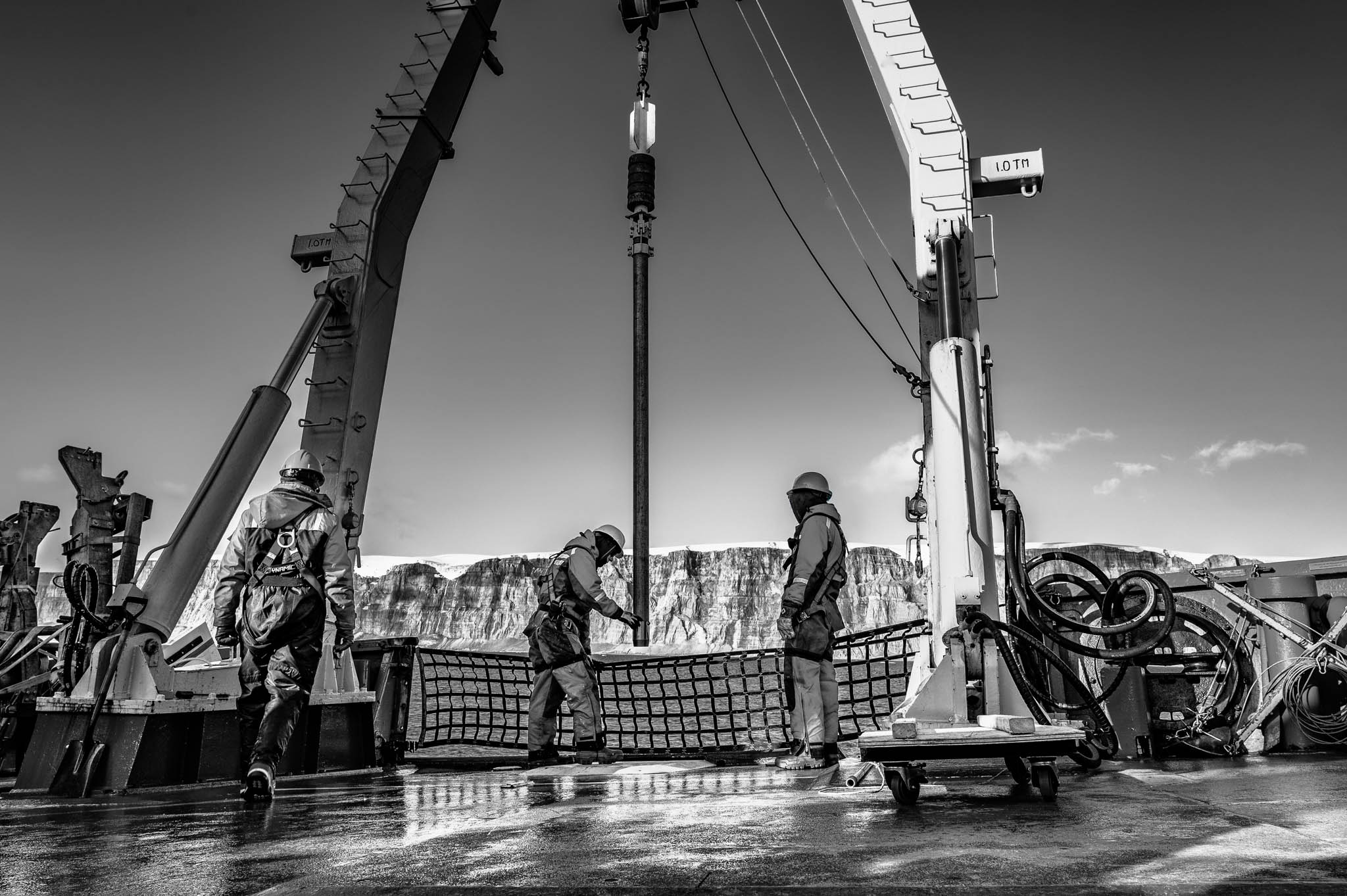 15 août 2017 - Passage du Nord-Ouest, Nunavut, Canada. Le professeur Jean-Carlos Montero Serrano et le technicien Pascal Rioux déploient, avec l'assistance des matelots du NGCC Amundsen, le carottier à piston de 10 mètres et 2000 kg, une opération complexe nécessitant plusieurs heures et une précision absolue. Ce mastodonte permet de prélever de longues carottes sédimentaires pouvant remonter jusqu’à 15 000 ans d’histoire, selon le taux d’accumulation des sédiments