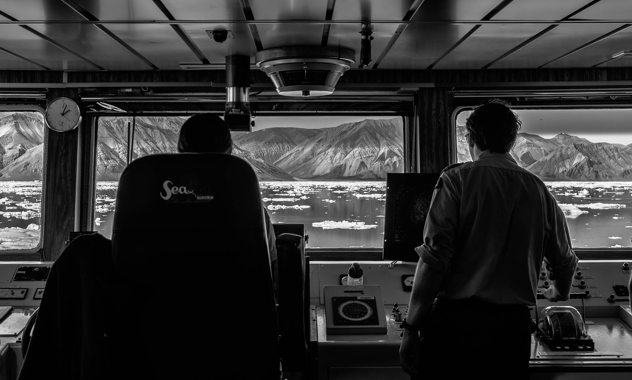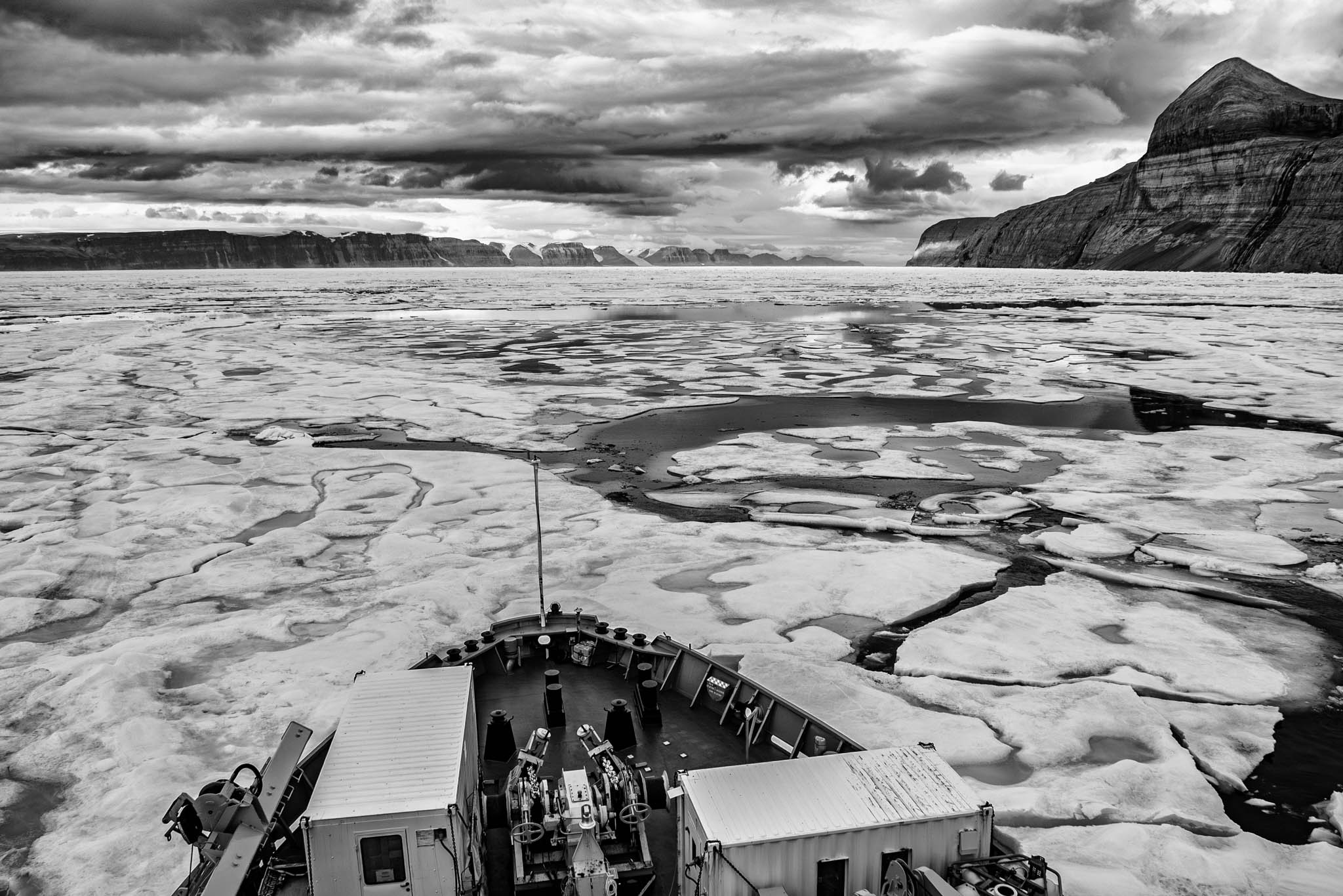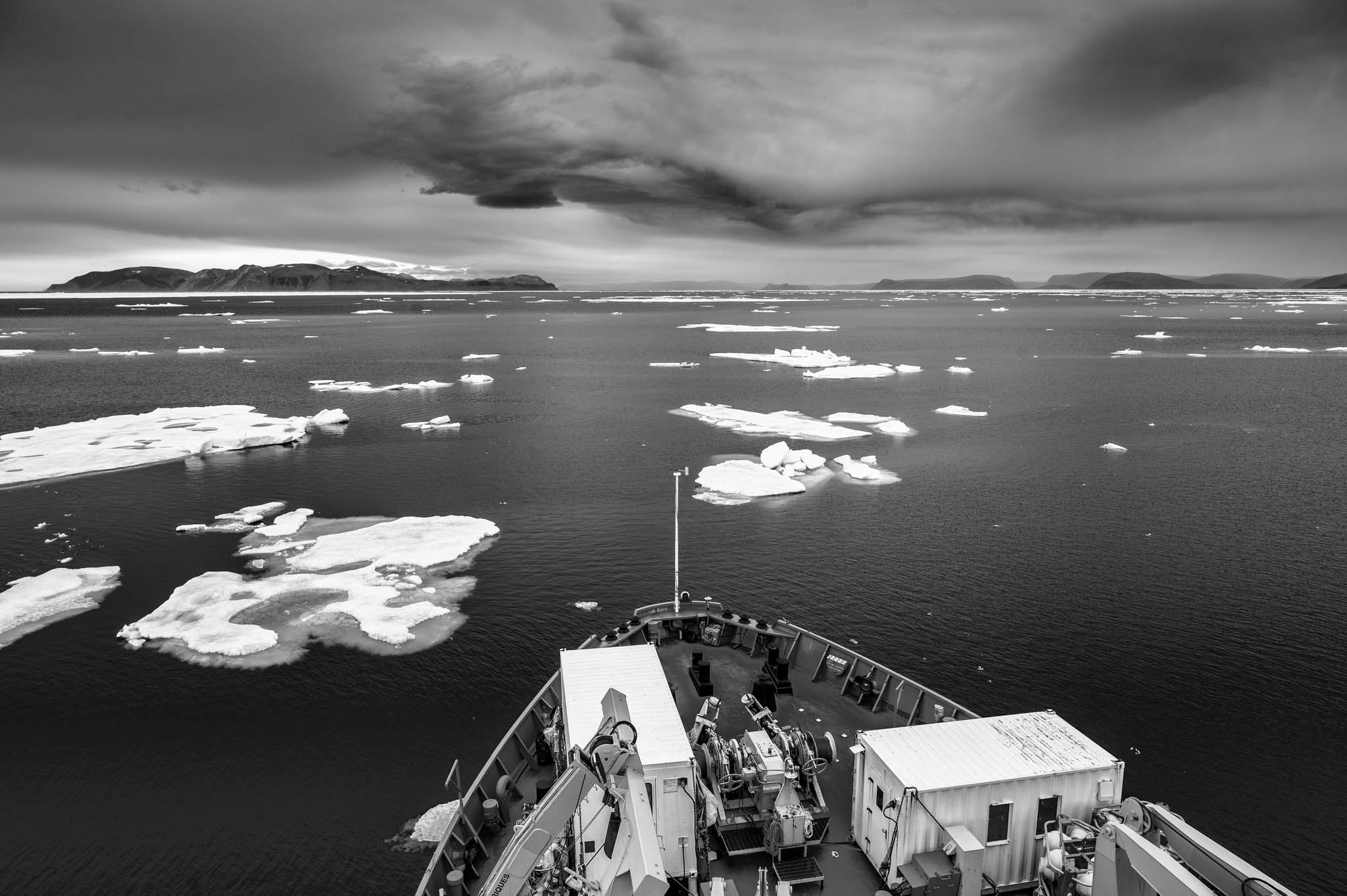 21 juillet 2019 — Détroit de Nares, Haut-Arctique. Le 2e officier de navigation Xavier Côté dirige les manœuvres pour entrer dans le Passage Kennedy avec les monts Victoria et Albert comme toile de fond. Faisant partie du détroit de Nares, le passage Kennedy, aussi appelé canal Kennedy, est un passage maritime de l’océan Arctique entre le Groenland et l’île Ellesmere. Les monts Victoria et Albert (80°30′N 74°8′W) sont une chaîne de montagnes qui court sur la côte est de l’île d’Ellesmere, au Nunavut. La chaîne est l’une des chaînes les plus septentrionales du monde et de la cordillère arctique. La plus haute montagne de la chaîne est le sommet de la calotte glaciaire Agassiz, qui culmine à 2 201 m. La chaîne a une superficie de 37 650 km2.