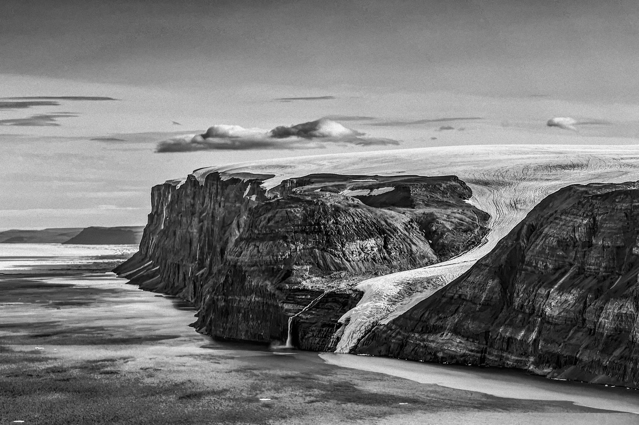 22 juillet 2019 — Fjord de Petermann, Groenland. La calotte glaciaire du Groenland, qui contient assez d’eau pour faire monter le niveau de la mer de 7 mètres, fond à un rythme alarmant, libérant chaque année plus de 280 milliards de tonnes de glace dans l’océan. Ce phénomène, principal moteur de l’élévation du niveau de la mer, menace les nations insulaires, accentue les ondes de tempête et aggrave les catastrophes, comme les ouragans Katrina et Sandy. De plus, l’apport massif d’eau douce peu salée pourrait perturber la circulation océanique mondiale (AMOC), un système crucial pour le transport de chaleur et la régulation du climat planétaire. Bien que cette désintégration s’étende sur des centaines d’années, la calotte a probablement atteint un point de non-retour, un signe indéniable de l’urgence climatique.