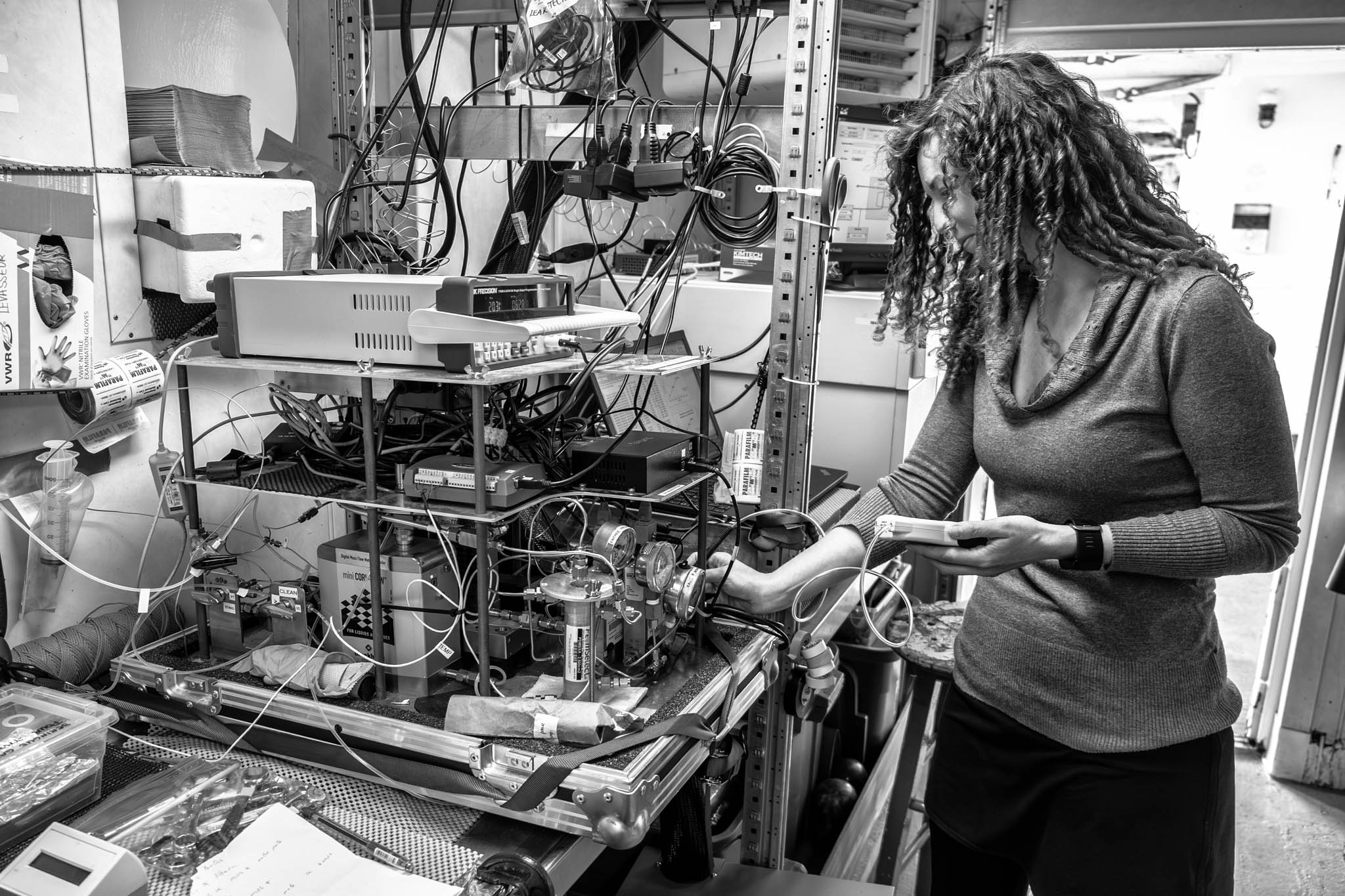 9 juillet 2017, dans le détroit de l’Hudson, l’océanographe Martine Lizotte vérifie l’étalonnage de ses instruments. Ses recherches portent sur la dynamique du cycle du soufre marin, en particulier sur le diméthylsulfure (DMS), un gaz refroidisseur de climat, et son précurseur métabolique, le diméthylsulfoniopropionate (DMSP). Elle étudie les échanges océan-atmosphère de gaz climatiques et leur variabilité dans un contexte de changements climatiques. Ses travaux explorent notamment des enjeux, tels que l’acidification des océans, particulièrement marquée dans des régions sensibles comme l’Arctique, ainsi que les modifications de l’approvisionnement en micronutriments essentiels, comme le fer. Ces processus ont un impact direct sur les communautés de plancton et la production de DMS.
