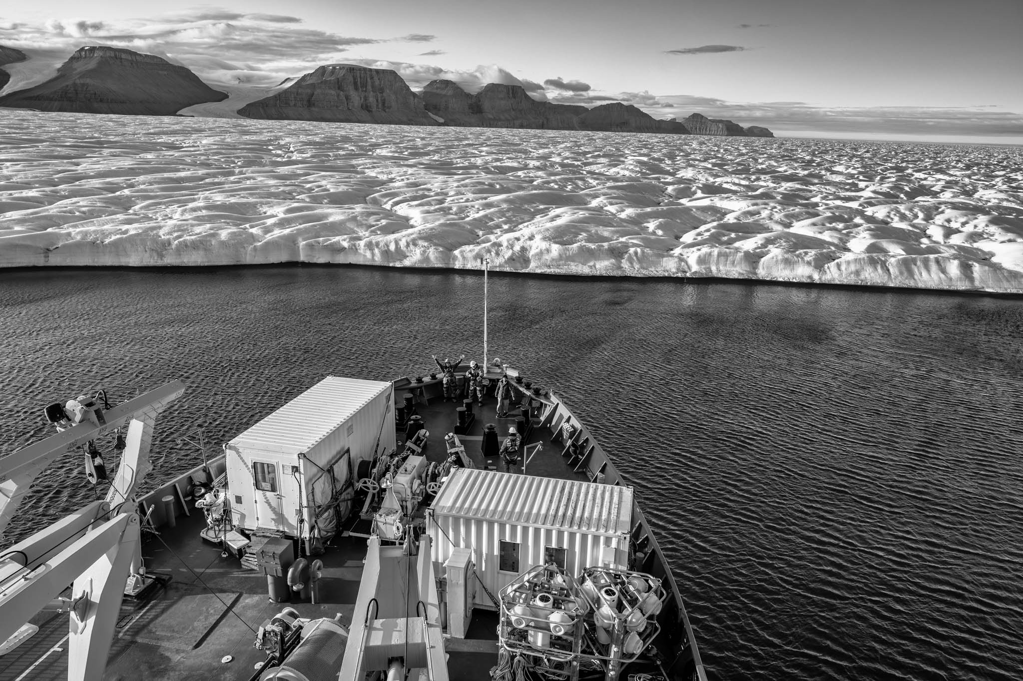 24 août 2019 - Fjord de Coronation, Terre de Baffin, Nunavut, Canada. Le NGCC Amundsen s'approche du glacier Coronation afin de prélever des carottes sédimentaires. Ces échantillons permettront aux scientifiques d'étudier l'impact du changement climatique sur la région, en reconstituant l’histoire environnementale et les fluctuations passées du glacier. L'analyse des sédiments aidera également à comprendre les interactions entre la glace, la mer et les sédiments, tout en évaluant les risques géologiques et environnementaux liés à la fonte accélérée des glaciers dans l'Arctique. Ces travaux font partie des efforts pour mieux comprendre les transformations rapides de cet écosystème sensible.