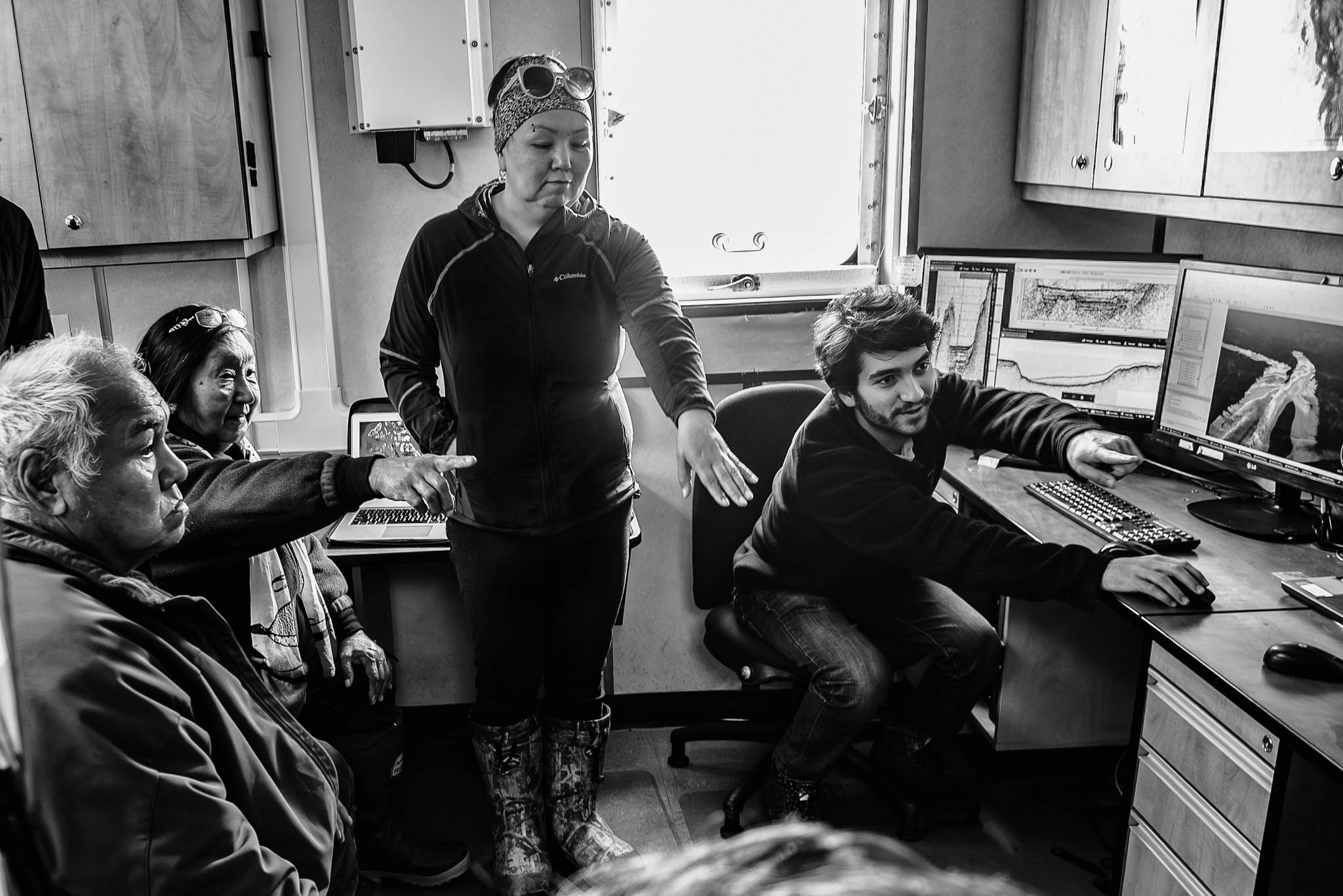 30 juillet 2019 — Grise Fjord. Les anciens de Grise Fjord partagent des informations avec Daniel Amirault, technicien en géomatique marine sur des événements passés pouvant concorder avec données de bathymétrie. L’Arctique étant très peu cartographié, les données de bathymétrie vont permettre de mettre les cartes à jour, alors que la navigation risque d’augmenter dans les prochaines années. Les océanographes, les écologistes et les biologistes bénéficient de la collaboration avec les communautés locales dans le cadre de leurs recherches en Arctique.