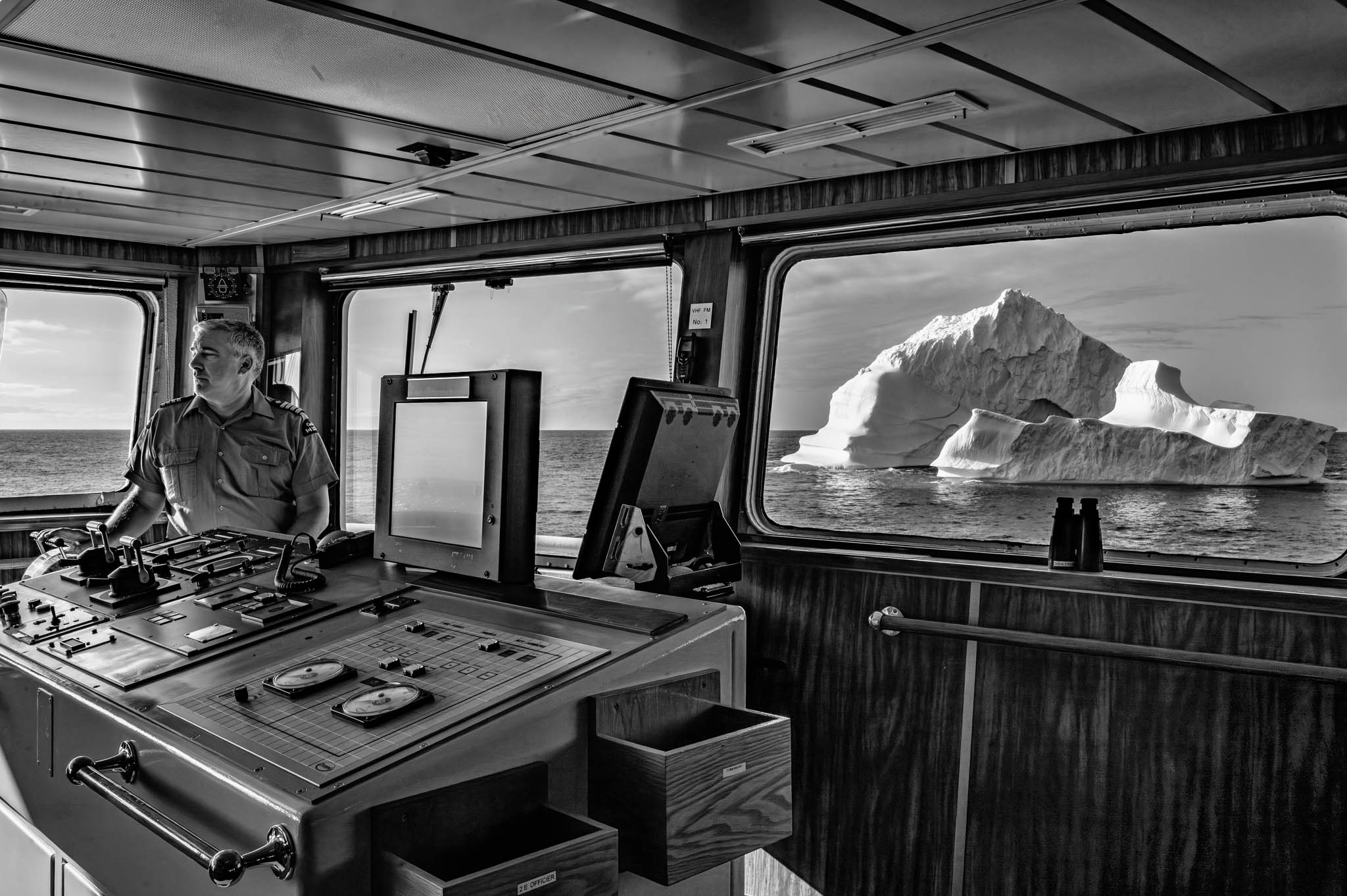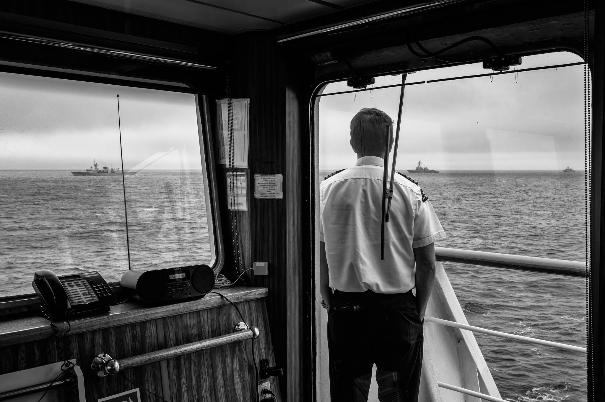30 juillet 2020 - Mer de Baffin. Un officier du NGCC Amundsen observe un exercice militaire dans le cadre de l’opération NANOOK-TUUGAALIK, où le brise-glace scientifique a temporairement suspendu ses recherches pour collaborer avec des alliés. Menée dans l’Arctique, cette opération rassemble des navires du Canada, des États-Unis, du Danemark et de la France, visant à renforcer l’interopérabilité et la coordination en mer. Les Forces armées canadiennes, en partenariat avec des gouvernements autochtones et territoriaux, utilisent ces exercices pour protéger la souveraineté nordique et améliorer leur capacité d’intervention dans des conditions extrêmes.