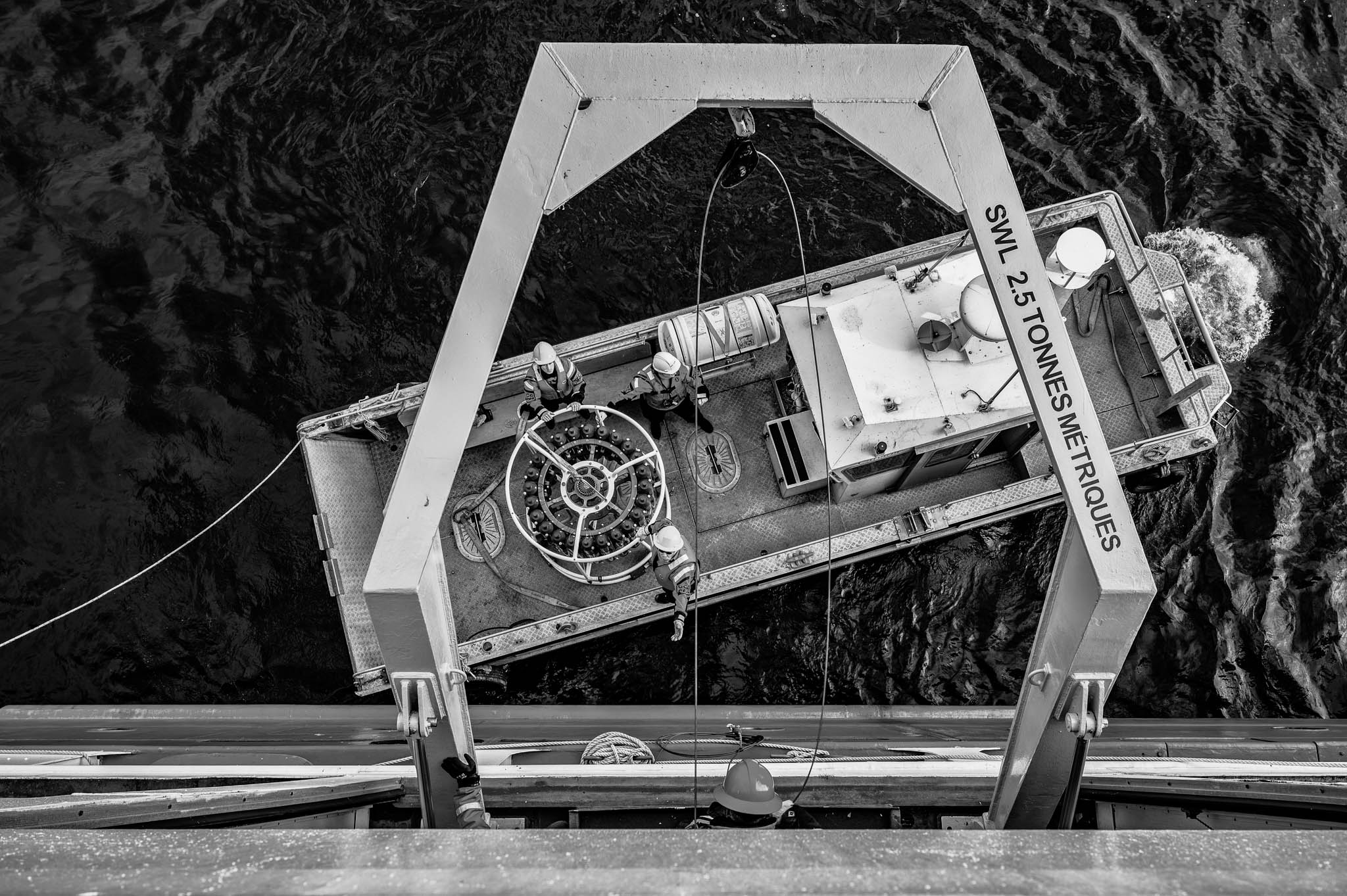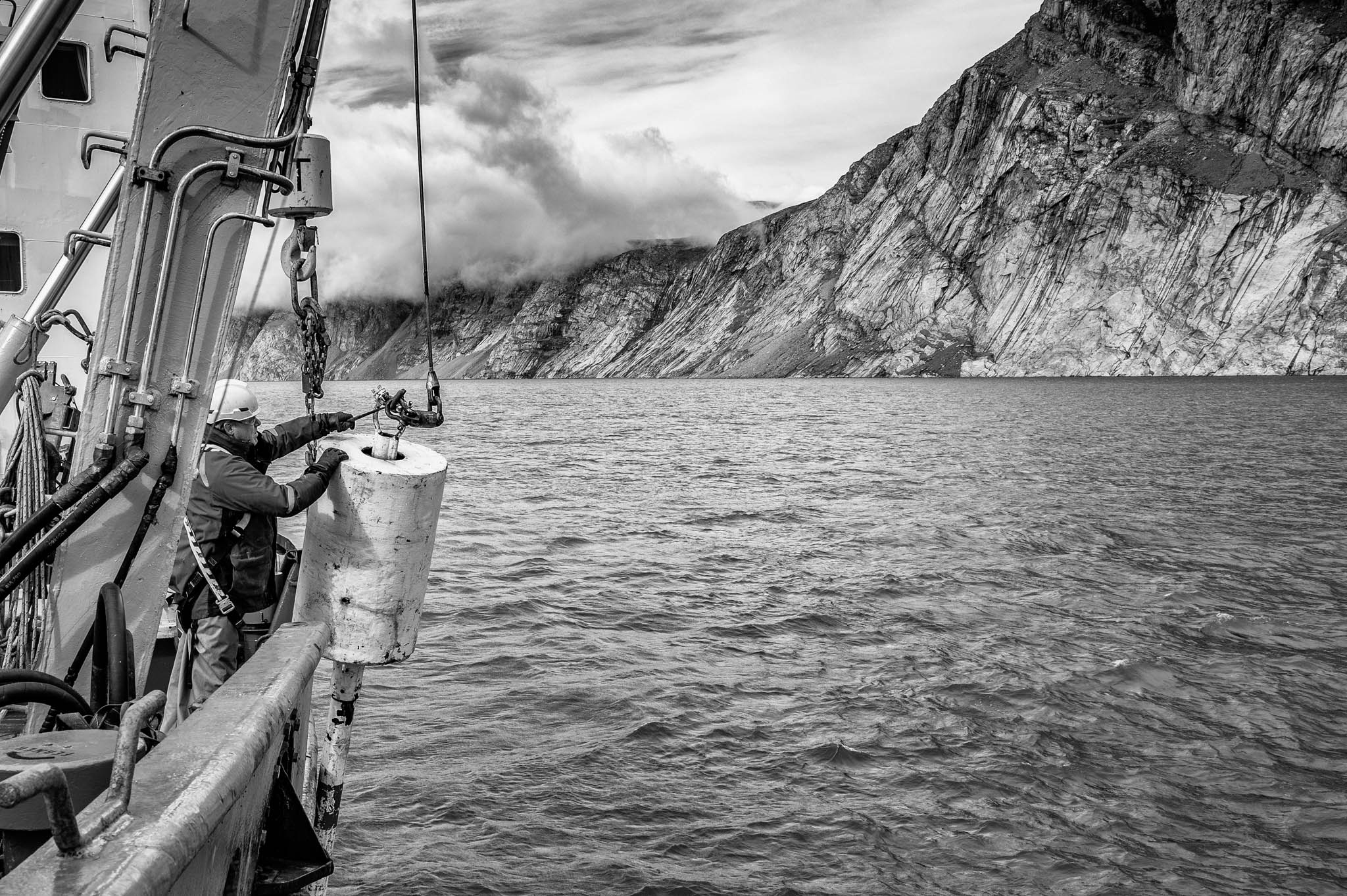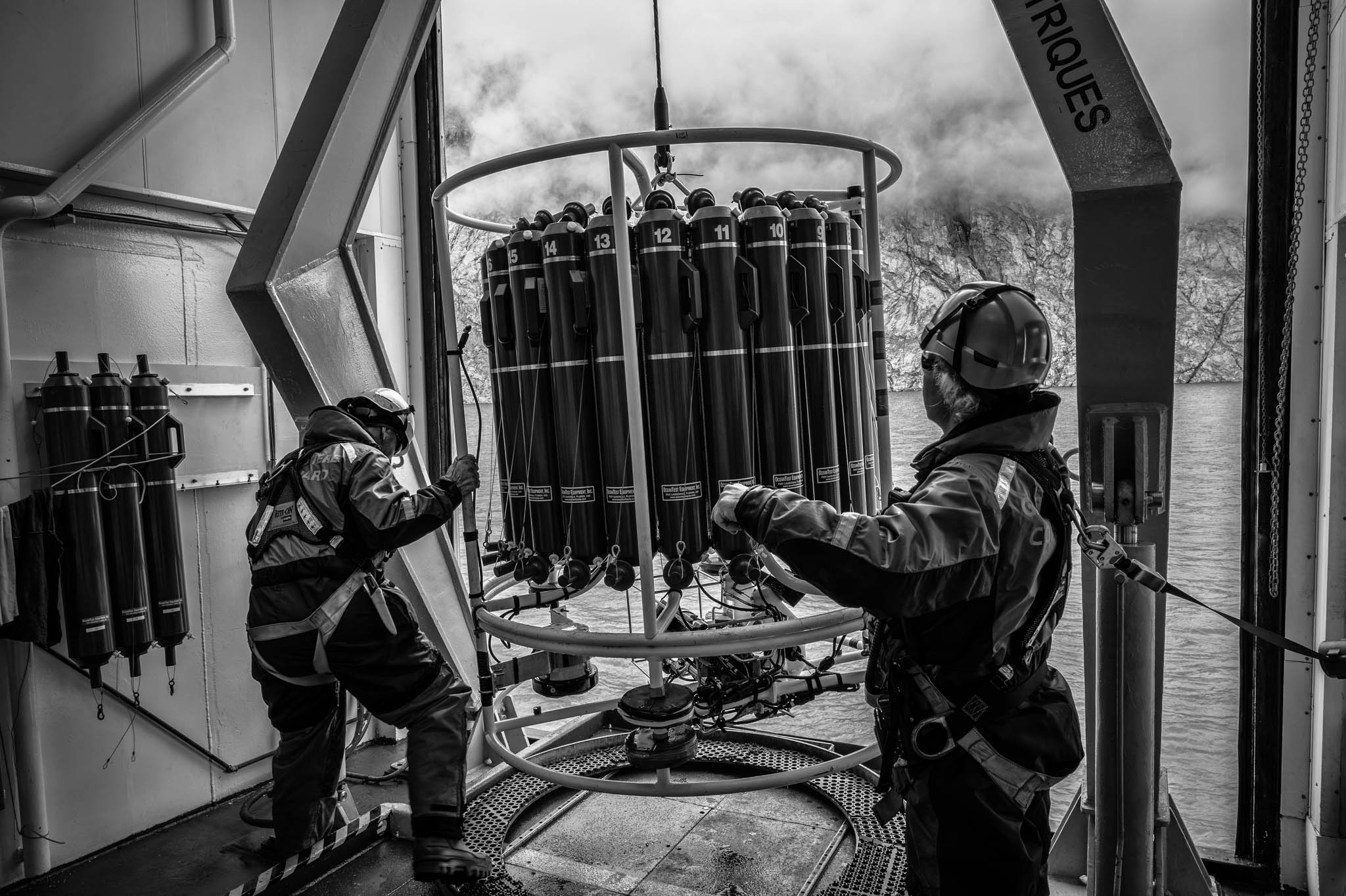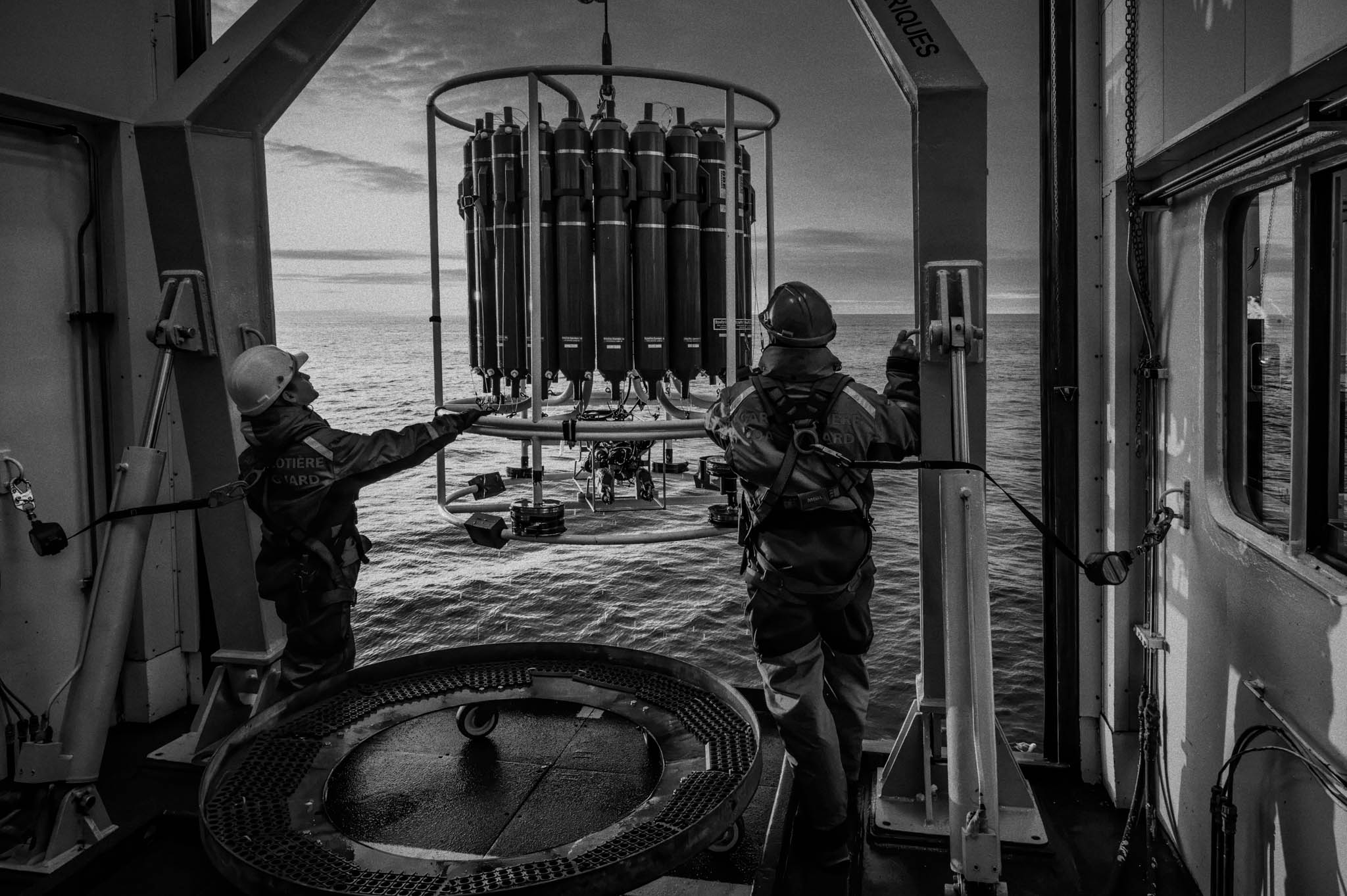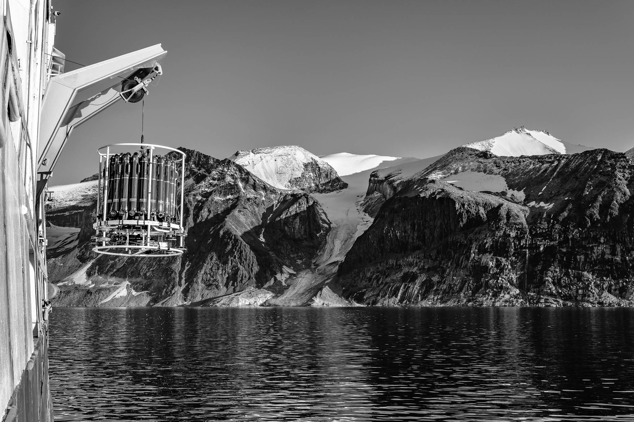 7 août 2021 - Fjord de Gibbs, Terre de Baffin, Nunavut, Canada. La CTD-Rosette est déployée depuis le NGCC Amundsen pour étudier les propriétés de l’eau du fjord à différentes profondeurs. Cet instrument mesure des paramètres clés comme la température, la salinité et la densité, tout en collectant des échantillons d’eau pour analyser leur composition chimique et biologique. Ces données aident les scientifiques à comprendre l’impact de la fonte glaciaire liée aux changements climatiques sur la circulation océanique, les écosystèmes marins et les risques géologiques sous-marins.
