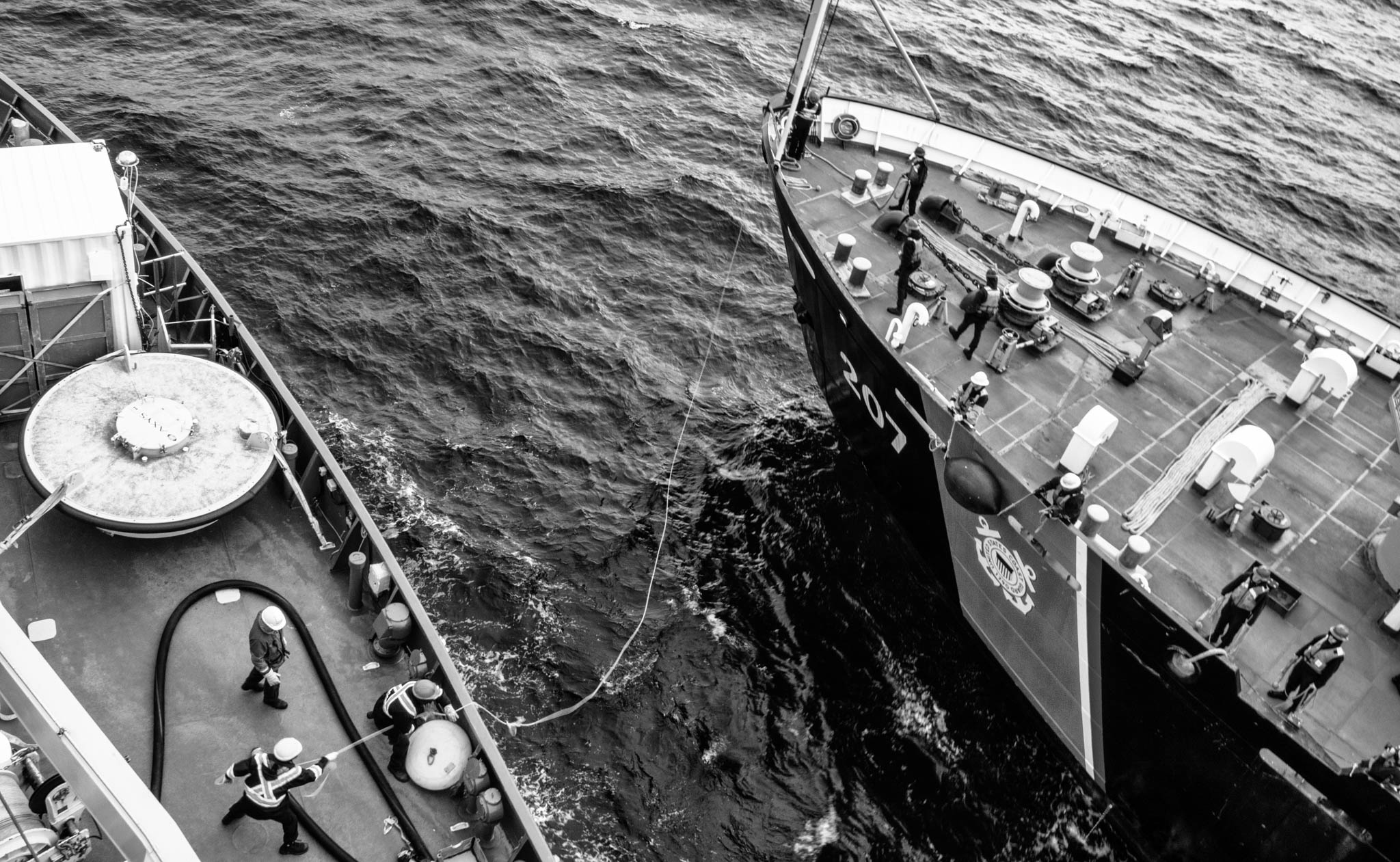 8 août 2017 - Golfe de la Reine Maud, Passage du Nord-Ouest. L’équipage du NGCC Amundsen a suspendu ses recherches scientifiques pour ravitailler en carburant le garde-côte américain Cutter Maple, facilitant sa traversée du passage du Nord-Ouest vers l’Atlantique. Le NGCC Terry Fox a par la suite ouvert le passage à travers les glaces pour le Maple, tandis que l’Amundsen reprenait sa mission scientifique.