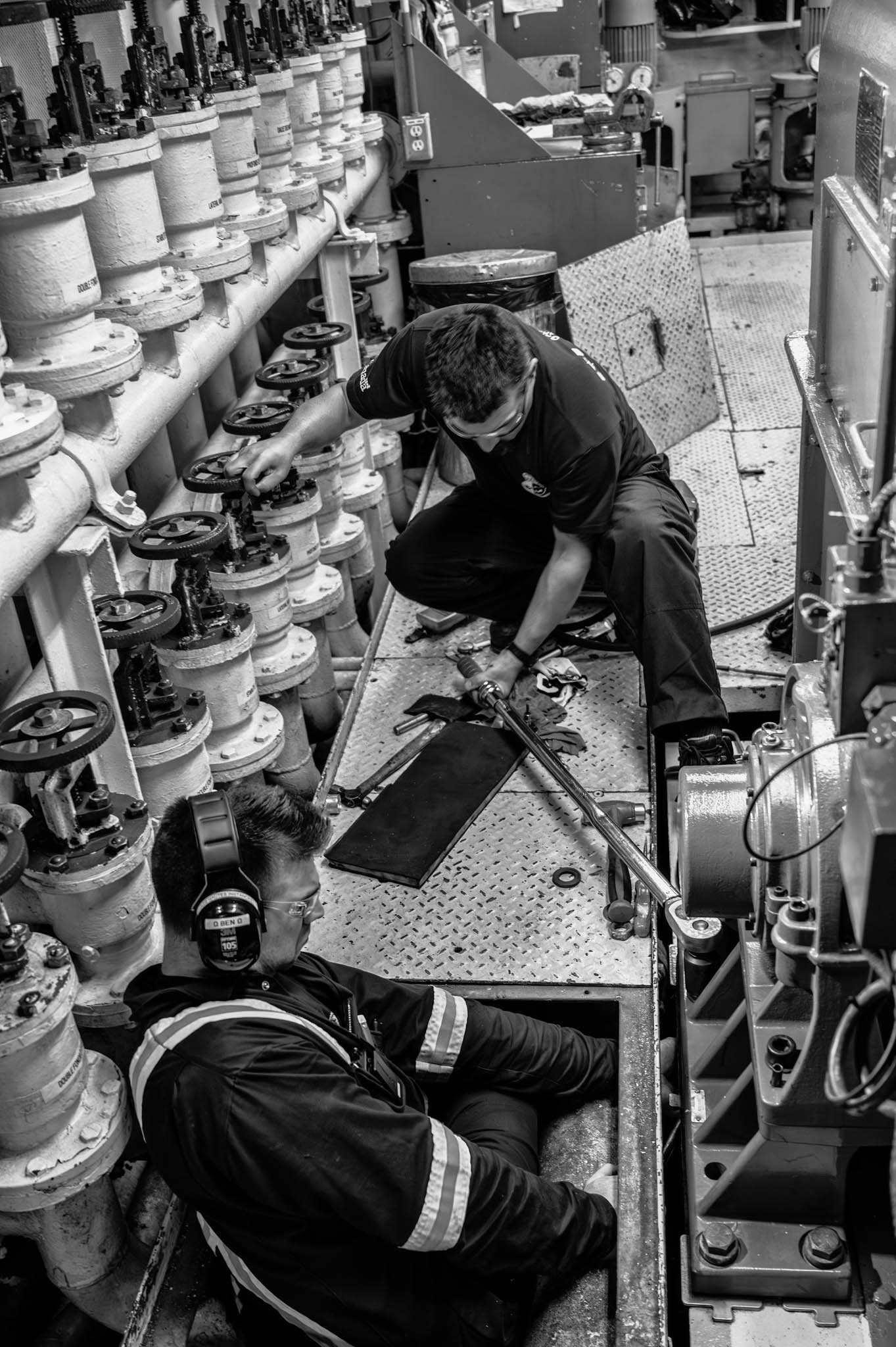18 août 2019 - Mer de Baffin. Une expédition de 112 jours en Arctique sur un brise-glace ne serait possible sans une équipe en salle des machines. Les six puissants moteurs de l’Amundsen et les autres systèmes mécaniques et électriques requièrent une présence 24 heures sur 24, afin d’assurer les surveillances, les entretiens et quelques fois, faire des réparations d’urgence. Ainsi lors des dernières semaines, une inspection de routine a permis de découvrir une réduction de l’isolation électrique des paliers d’alternateurs sur les moteurs. Des membres de l’équipe, comme ici l’officier électricien, Benjamin Désilets (en bas) et le l’ingénieur maritime sénior Nicholas Bouchard (haut), sont intervenus rapidement pour corriger la situation et ainsi éviter une dégradation des équipements.