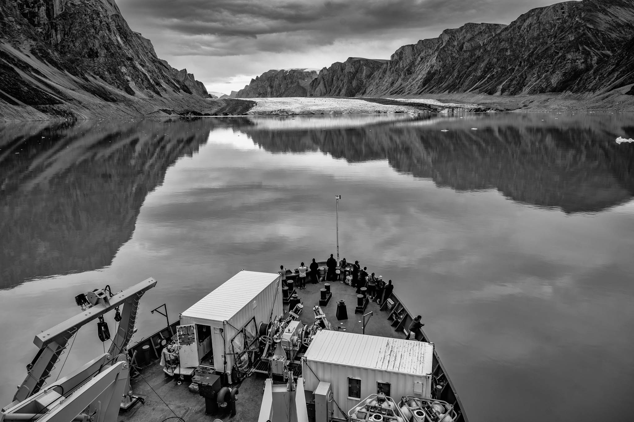 23 juillet 2019 — Fjord de Petermann. Le NGCC Amundsen pénètre dans le fjord pour atteindre le glacier Petermann, la plus grande langue glaciaire flottante de l’hémisphère Nord. Ce glacier, qui couvrait 1295 km² il y a dix ans, a perdu 34 % de sa masse depuis 2010, en raison des eaux plus chaudes de l’Atlantique qui s’infiltrent sous la glace, provoquant des fractures et des vêlages massifs d’icebergs, comme une plaque de 251 km² détachée en 2010, équivalente à la superficie de l’île de Montréal. Des échantillons de sédiments et d’eau ont été collectés pour analyser les changements dans les propriétés des masses d’eau environnantes et étudier la dynamique à long terme du glacier dans le contexte du changement climatique.