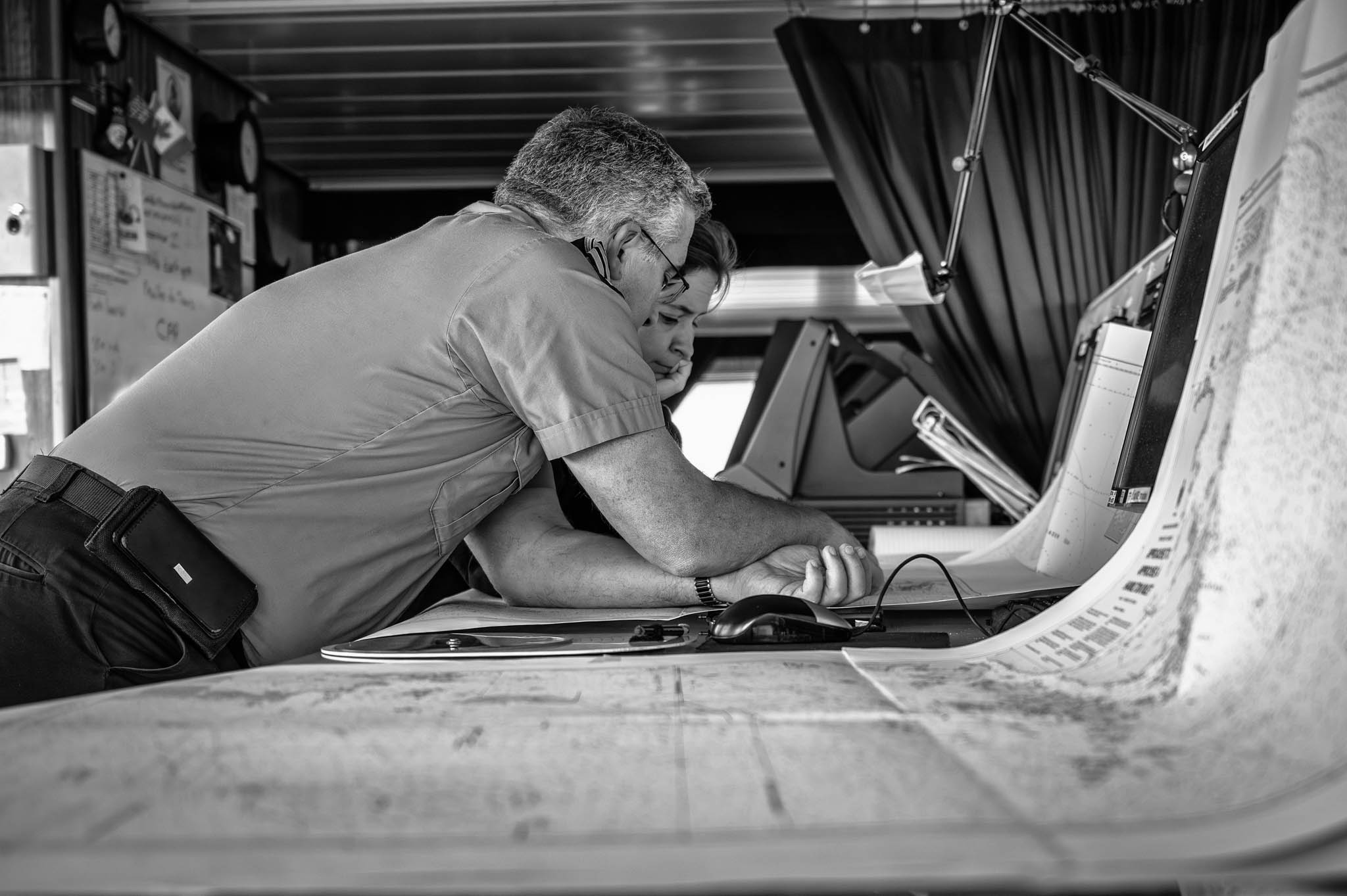 26 août 2019 - Mer du Labrador. Avec deux tempêtes sur notre trajectoire, nous avions à bien calculer notre route. La table couverte de cartes maritimes, le commandant Gariépy donne ses directives au 1er lieutenant Émilie Goulet afin qu’elle planifie les heures à venir. En choisissant judicieusement notre route à travers l’ouverture créée par l’oeil de la tempête de la mer du Labrador, nous avons réussi à la devancer et ainsi éviter d’avoir à nous cacher pour attendre qu’elle passe, ce qui nous place dans une position très avantageuse pour devancer aussi l’ouragan Dorian et reprendre les activités d’échantillonnage plus en amont dans le Golfe du St-Laurent.