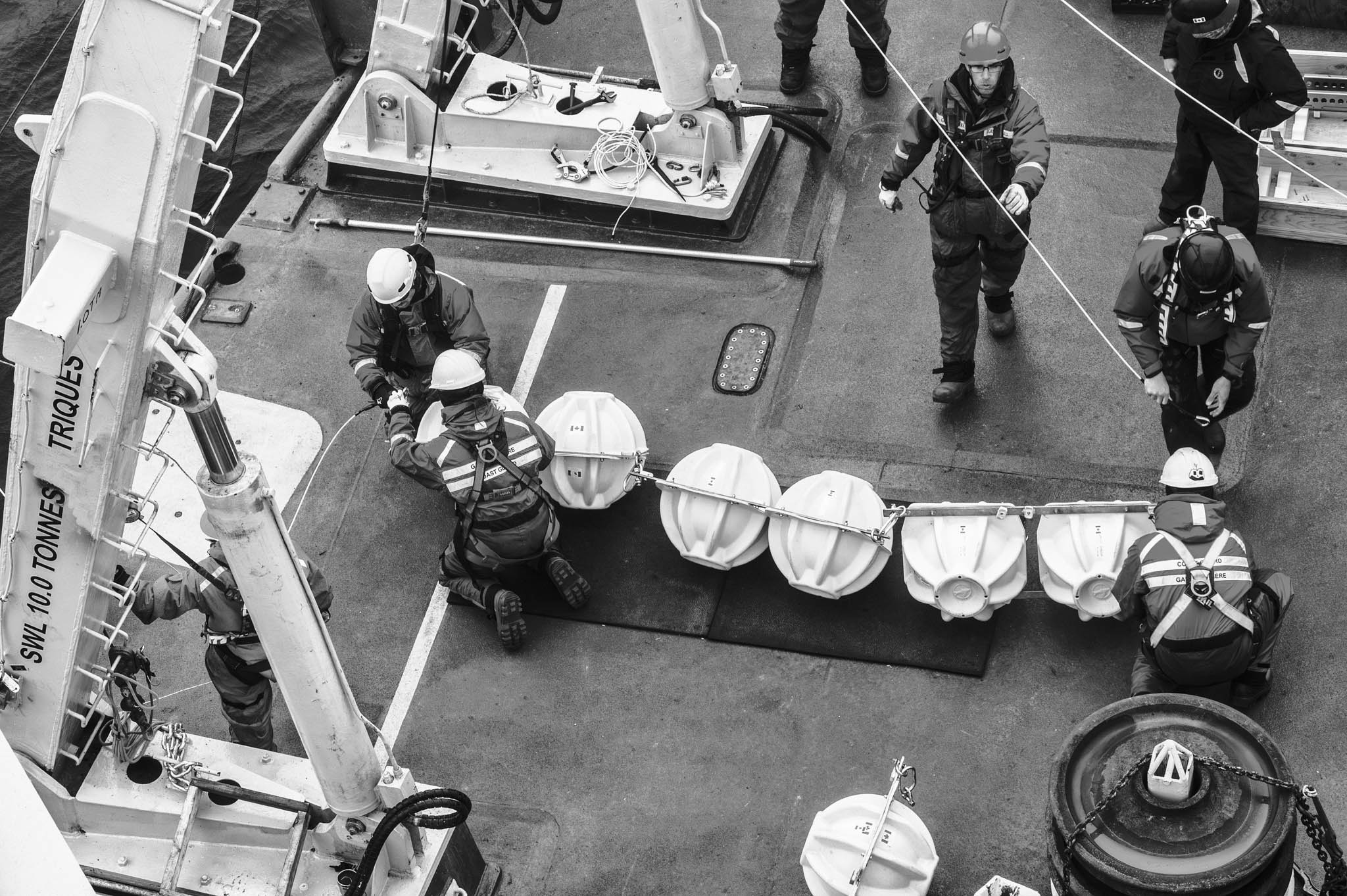 25 juillet 2017 - côtes occidentales du Groenland. William Barrière, matelot et Xavier Côté, 2e officier de navigation du NGCC Amundsen récupèrent un mouillage que les scientifiques à bord du navire, viennent de faire remonter à la surface. Les mouillages consistent en une ligne d'instruments et de bouées déployés dans la colonne d'eau pendant une longue période. Une fois déployés, les capteurs enregistrent des données sur les propriétés physiques des masses d'eau, les courants, la biogéochimie de l'environnement marin et le processus de sédimentation en continu pendant une période donnée (généralement environ un an). Les mouillages fournissent des données uniques sur les cycles annuels qui se déroulent dans les mers arctiques.