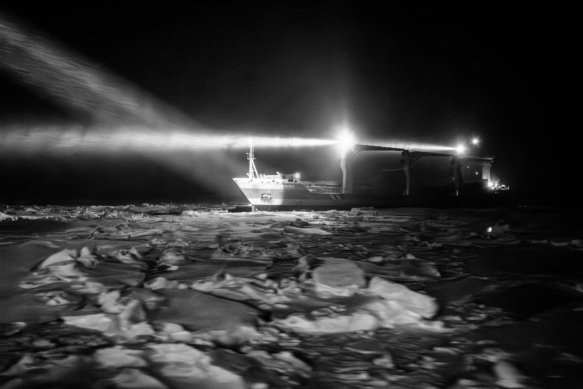 03 octobre 2020 - Détroit de Franklin, Passage du Nord-Ouest. Le NGCC Amundsen ouvre la voie dans un pack de glace pluriannuelle pour le cargo Adriaticborg. Bien que le changement climatique favorise la navigation estivale dans l'Arctique, la fragmentation accrue de la calotte polaire entraîne une dérive croissante de glace épaisse dans les canaux de l’archipel arctique canadien, perturbant la navigation. Entre 2007 et 2021, cette dérive a réduit la durée de la saison de navigation : l’est de la mer de Beaufort a perdu 14 semaines de navigabilité, et les détroits de M’Clure et du Vicomte de Melville, cinq semaines.