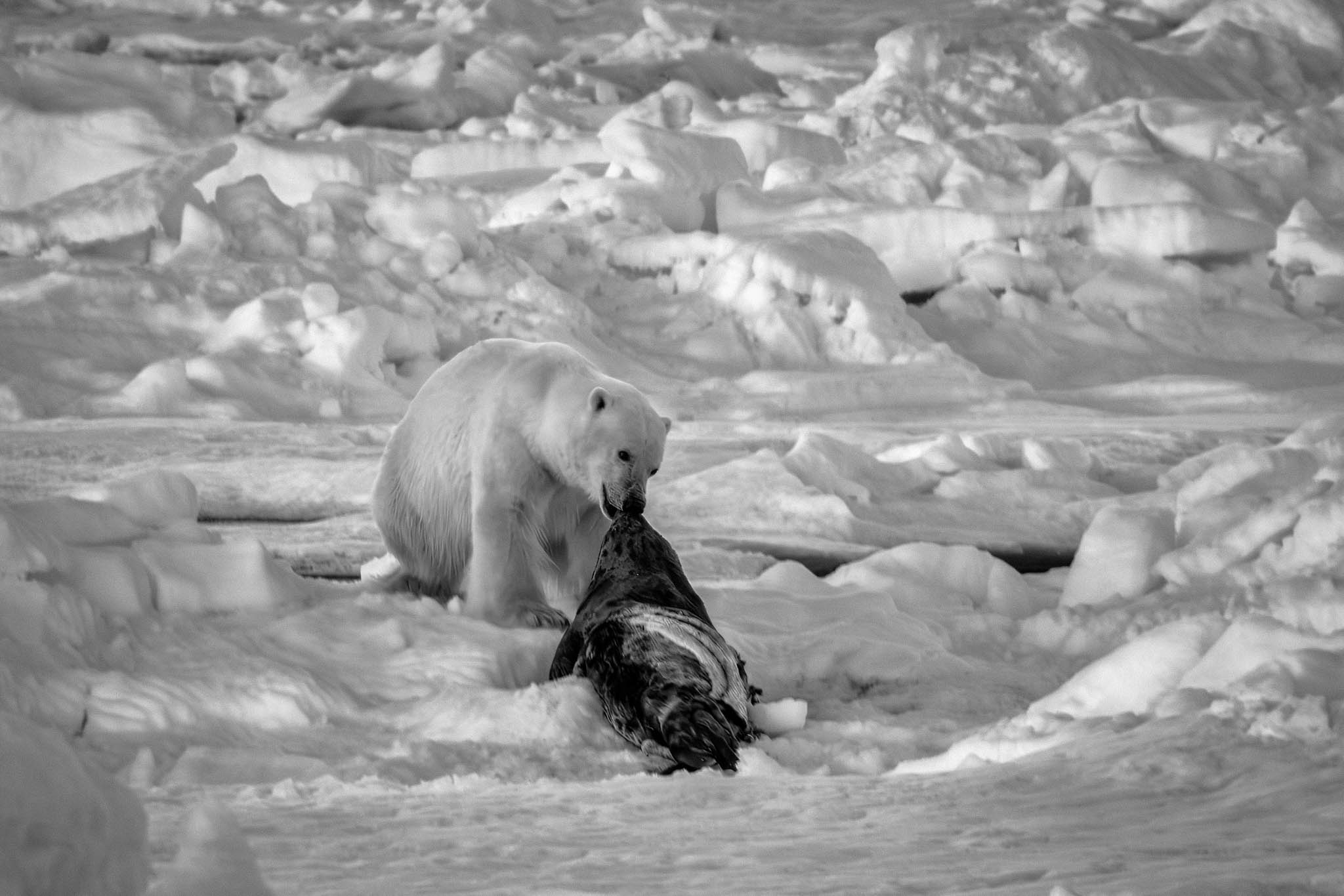 20 juillet 2017 - détroit de Davis, Canada - Un ours polaire avec un phoque fraîchement tué est dépassé par le navire. Les ours polaires font partie des animaux les plus touchés par le déclin saisonnier et annuel de l’étendue de la glace de mer arctique, car ils dépendent de la glace de mer pour des activités essentielles, telles que la chasse, les déplacements et la reproduction. L’ours polaire est une espèce vulnérable, mais personne ne sait vraiment comment ils réussiront à s’adapter. Les Inuit observent des changements de comportement dans les habitudes de chasse des ours. Aussi, de plus en plus d’ours hybrides fertiles issus de la rencontre entre des ours grizzlys et des ours polaires sont rencontrés.