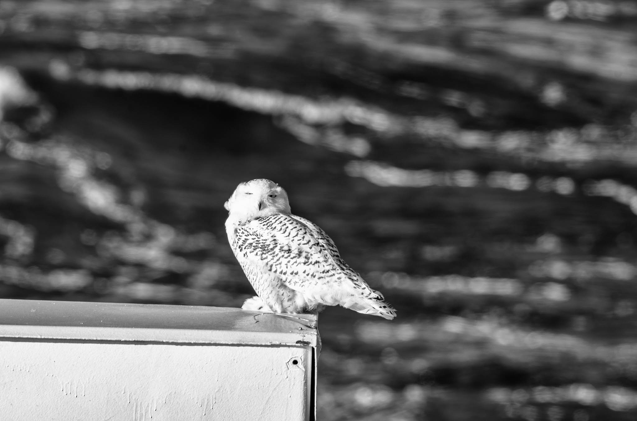 11 octobre 2020 - Mer du Labrador. Un harfang des neiges se repose sur le toit d’un conteneur du NGCC Amundsen pendant sa migration vers le sud du Québec. Ce moment de pause lui permet d’économiser de l’énergie et de se protéger des prédateurs et des intempéries. Contrairement à l’idée reçue, ces migrations hivernales ne sont pas causées par un manque de nourriture dans le Nord, mais par une abondance estivale de proies, favorisant la survie des jeunes comme l’a démontré une étude récente publiée dans Oecologia. Cette recherche, dirigée par la scientifique Audrey Robillard, s’appuie sur 18 ans d’observations et souligne l’importance de l’Arctique pour la survie de cette espèce emblématique.
