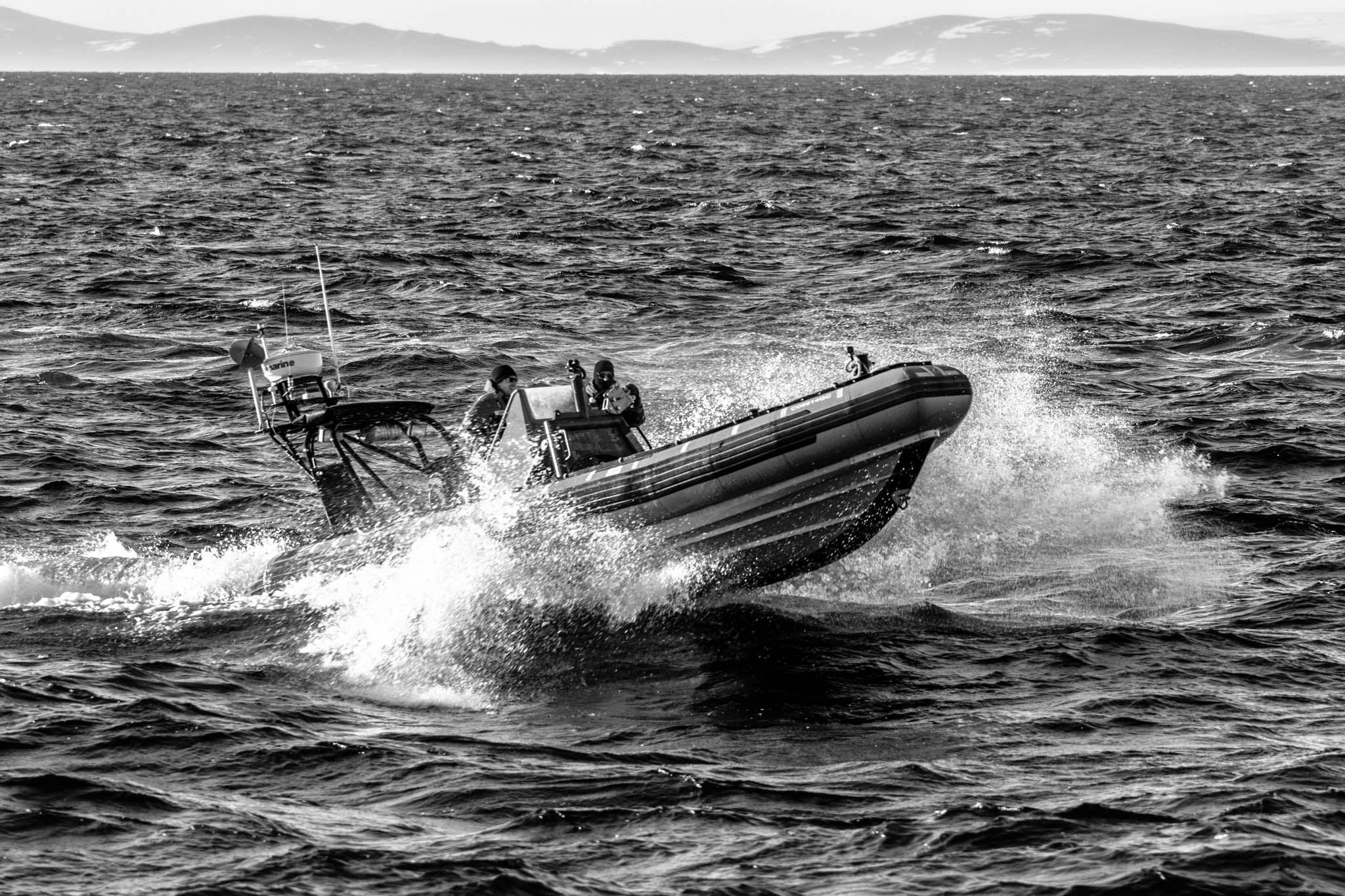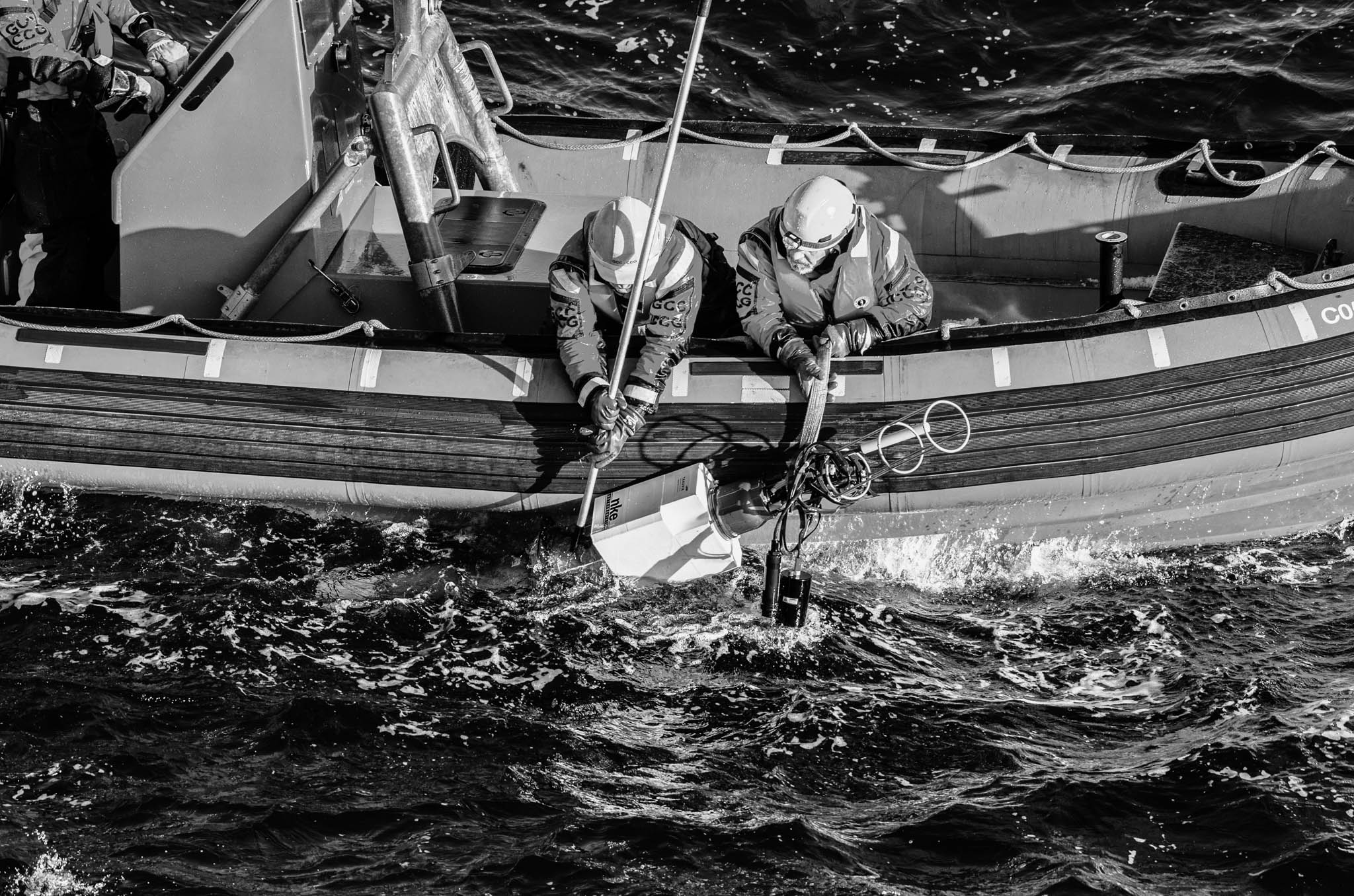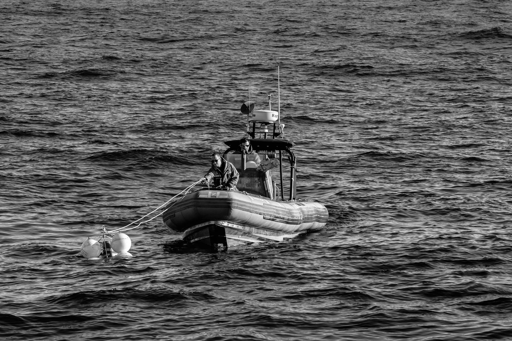 23 juillet 2017 - côtes du Groenland. William Barrière, matelot et Xavier Côté, 2e officier de navigation du NGCC Amundsen partent à bord d'un zodiac afin de récupérer un mouillage que les scientifiques à bord du navire, viennent de faire remonter à la surface. Les mouillages consistent en une ligne d'instruments et de bouées déployés dans la colonne d'eau pendant une longue période. Une fois déployés, les capteurs enregistrent des données sur les propriétés physiques des masses d'eau, les courants, la biogéochimie de l'environnement marin et le processus de sédimentation en continu pendant une période donnée (généralement environ un an). Les mouillages fournissent des données uniques sur les cycles annuels qui se déroulent dans les mers arctiques