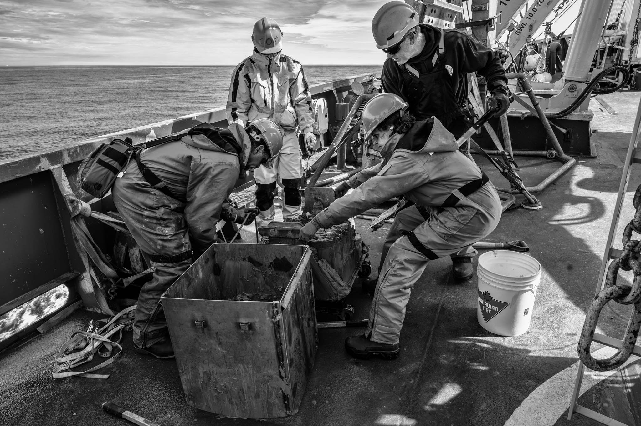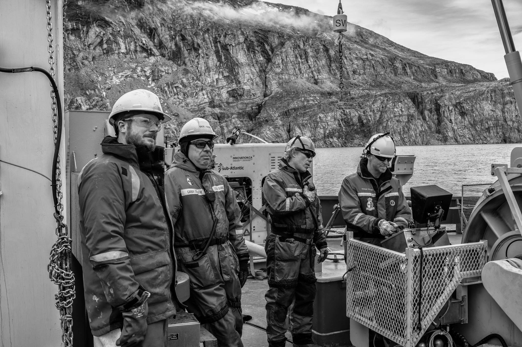 7 août 2021 - Fjord de Gibbs, Terre de Baffin, Nunavut, Canada. Alexandre Normandeau (casque blanc, à gauche), géoscientifique marin à l'Institut océanographique de Bedford, et le chef officier Jean Gaumond observent les opérations de carottage menées par le maître d'équipage Yannick Gagnon (casque rouge) et le matelot David Cartier. Les carottes de sédiments, prélevées à plus de 300 mètres de profondeur, permettent d’étudier l’impact de la fonte des glaciers sur l’environnement sédimentaire, de reconstituer l’histoire environnementale du fjord et d’évaluer les géorisques marins tels que les glissements sous-marins. Ces études sont essentielles pour comprendre les effets des changements climatiques, prévenir les catastrophes naturelles comme les tsunamis, protéger les écosystèmes sensibles et sécuriser les activités humaines croissantes dans l’Arctique.