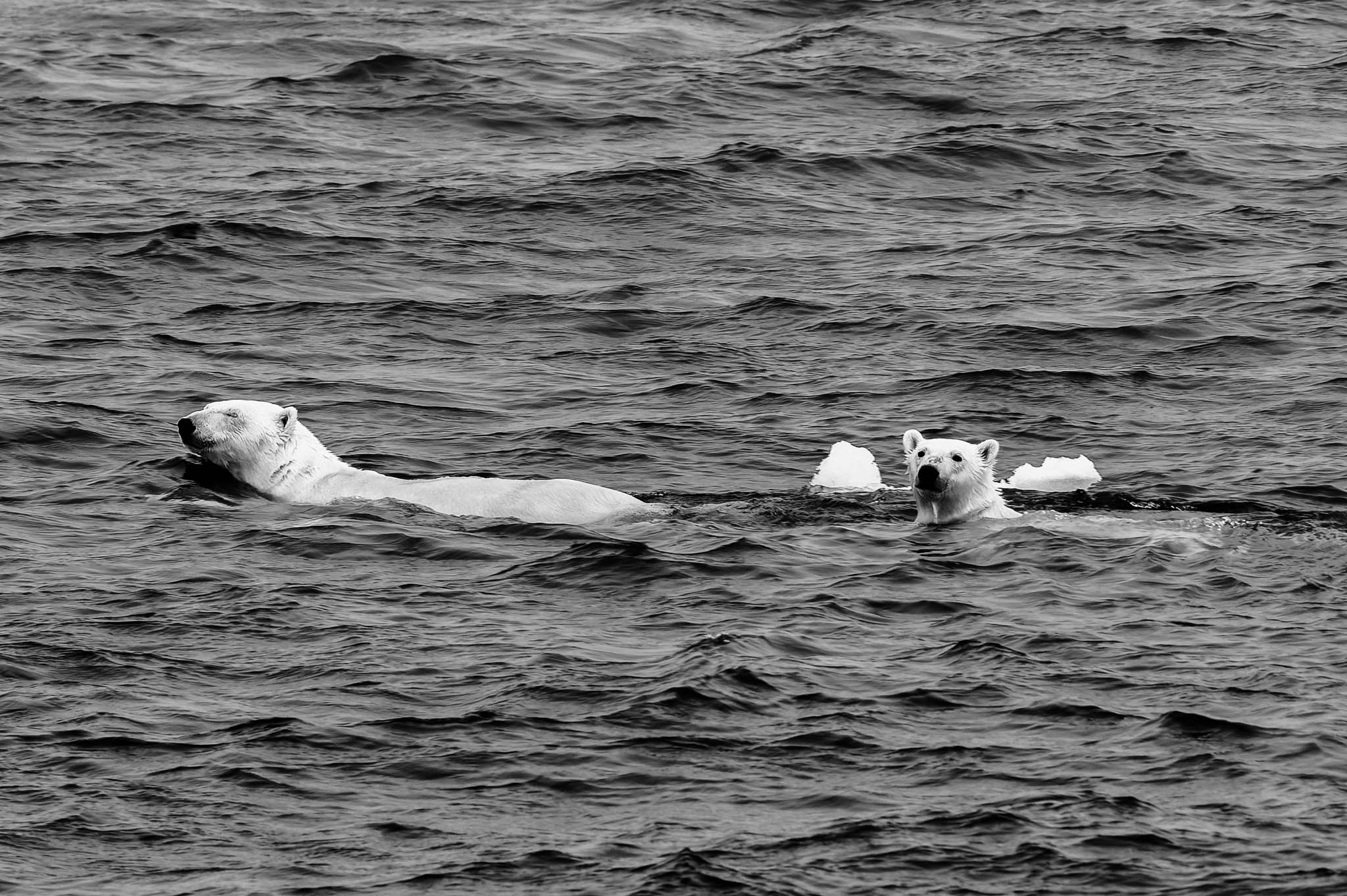 2 août 2021 - Mer de Baffin. Une mère ours polaire et son petit nagent dans une mer libre de glace, un spectacle de plus en plus fréquent en raison du réchauffement climatique. La fonte rapide de la banquise réduit l'habitat naturel des ours polaires, les forçant à parcourir de plus longues distances à la recherche de nourriture. Cette scène met en évidence les défis croissants auxquels ces animaux sont confrontés pour survivre dans un environnement en rapide transformation.