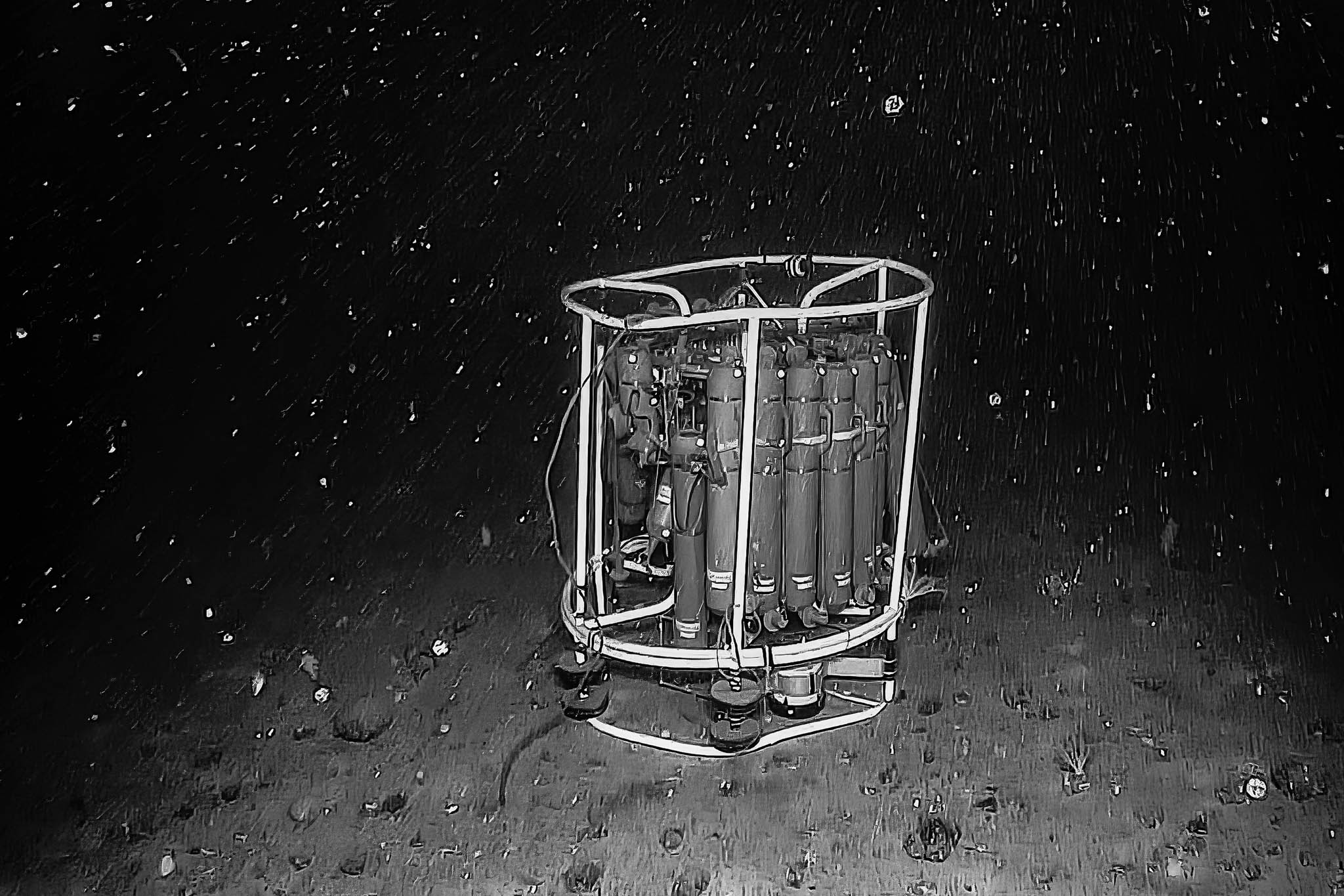 05 août 2021 - Mer de Baffin. La rosette perdue en 2019 par 225 mètres de fond, est retrouvée par le ROV, permettant à l'Amundsen de la remonter à bord (photo tirée de la vidéo du ROV)