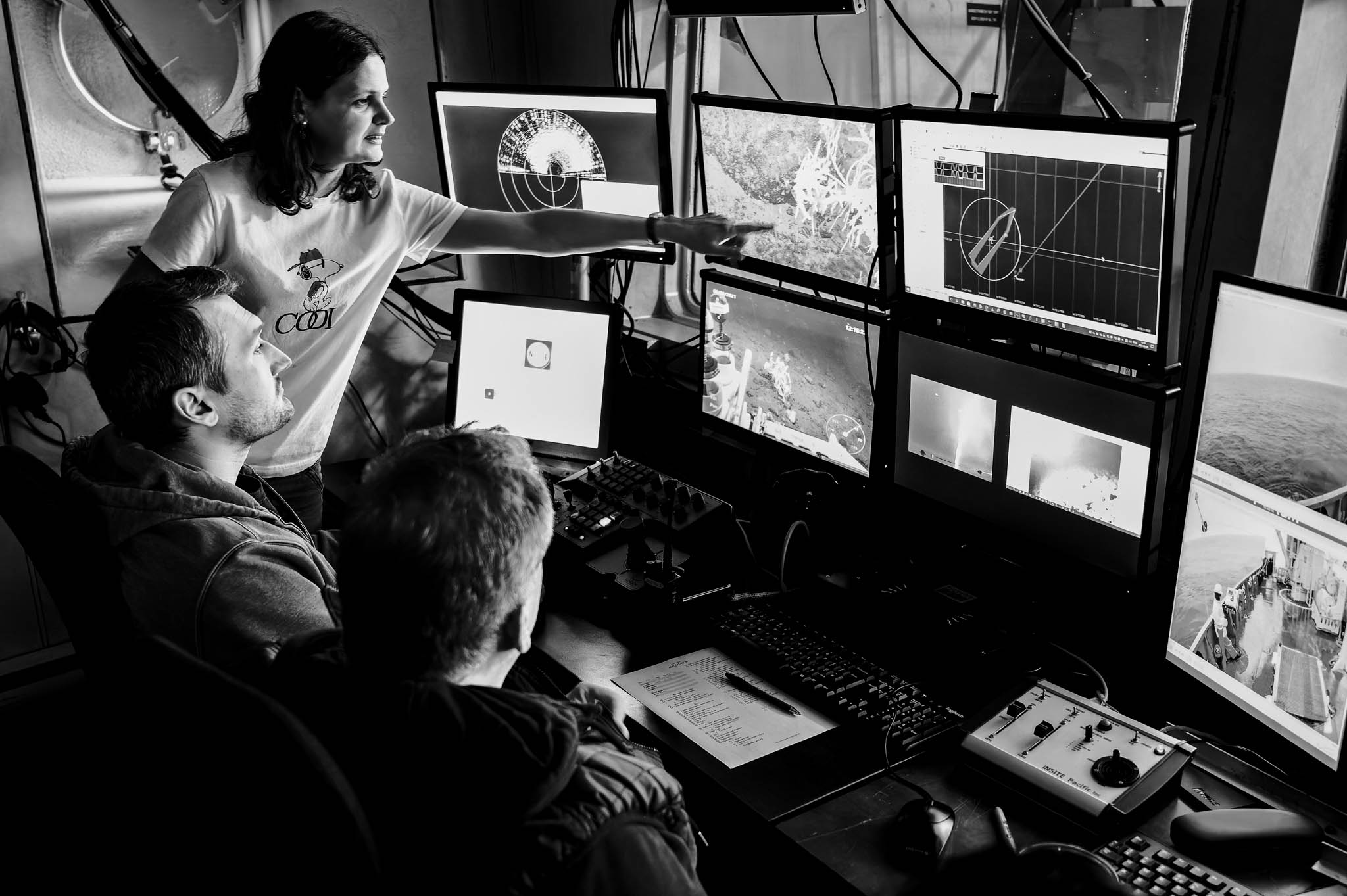 6 août 2021 - Mer de Baffin. Barbara de Moura Neves (PhD) donne des indications aux opérateurs du véhicule télécommandé (ROV). Les recherches de madame Neves portent principalement sur les taux de croissance et la structure de la taille des coraux d'eau profonde, en utilisant des échantillons collectés par le ROV.