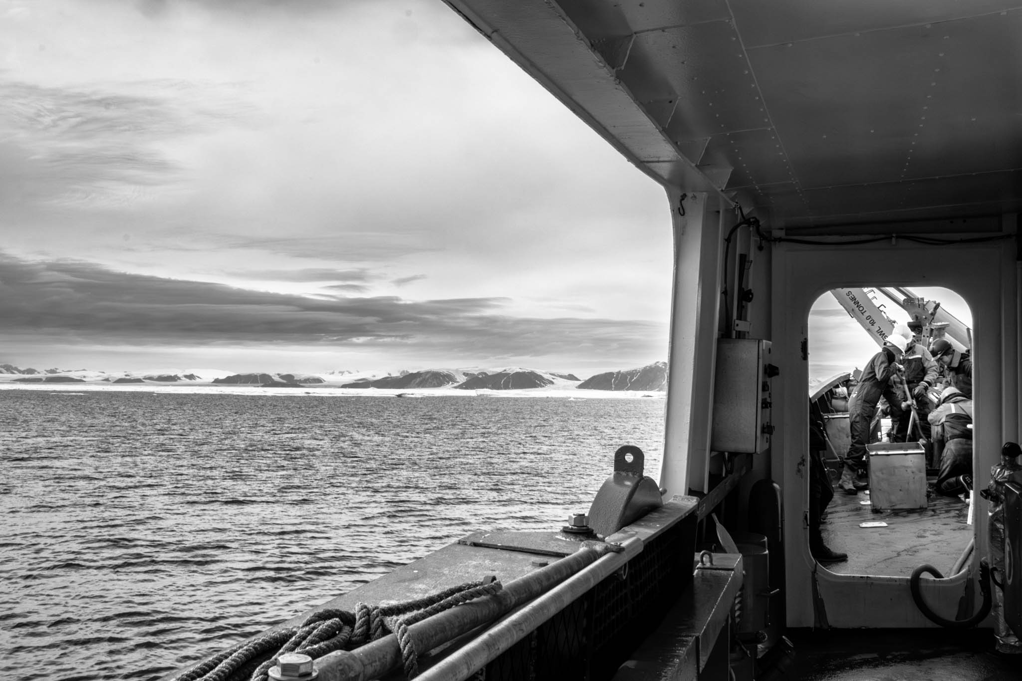 21 octobre 2020 - Détroit de Davis, Nunavut. Le chef officier Luc Verville et les marins Francis Olivier et Jocelyn Ménard quittent le NGCC Amundsen pour récupérer une balise Argo déployée l’année précédente par José Lagunas-Morales, ingénieur de recherche au laboratoire Takuvik. Ce laboratoire, affilié à l’Université Laval et à ArcticNet, participe au projet Argo, qui utilise 3 000 flotteurs robotiques pour observer en temps réel les propriétés de l’eau à travers les océans. Ces flotteurs plongent à 2 000 mètres, dérivent pendant 10 jours, remontent pour transmettre leurs données par satellite, puis replongent. José Lagunas-Morales a développé une technologie permettant aux balises de détecter la glace en surface et d'éviter les remontées inutiles, améliorant ainsi leur efficacité dans l'Arctique.